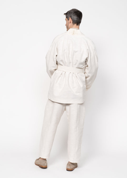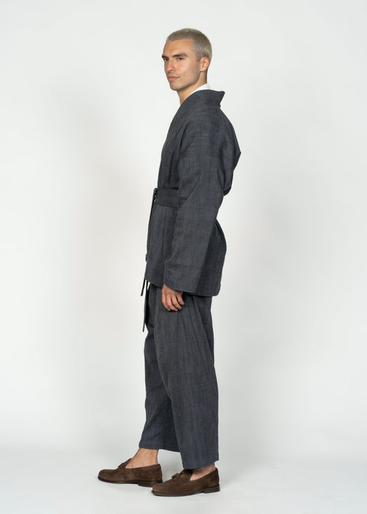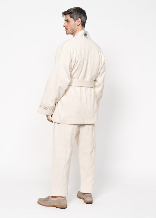 "The Flamma Suit" - crafted from materials that boast an unrivaled heritage, each thread is handwoven on traditional looms in Epirus, Greece. This meticulous process serves as a testament to the harmonious fusion of timeless craftsmanship and modern design sensibilities. By seamlessly blending centuries-old traditions with contemporary perspectives on fashion, "The Flamma Suit" embodies more than just sartorial elegance; it stands as a profound statement on our ethos towards fashion. Crafted to endure the test of time, this exceptional garment not only makes a bold statement in the realm of fashion but also reflects our deeply held convictions regarding the essence of style and its enduring impact.