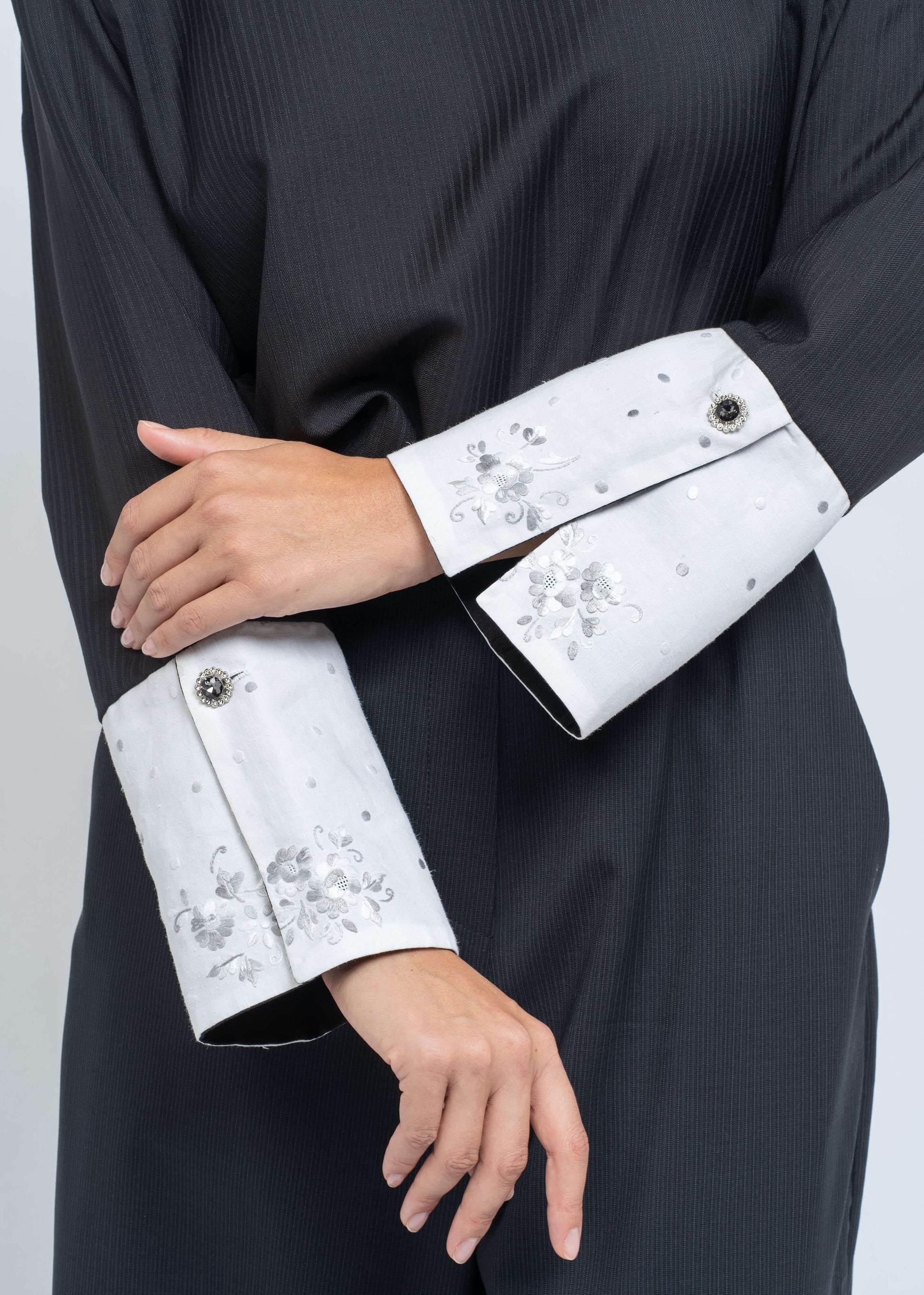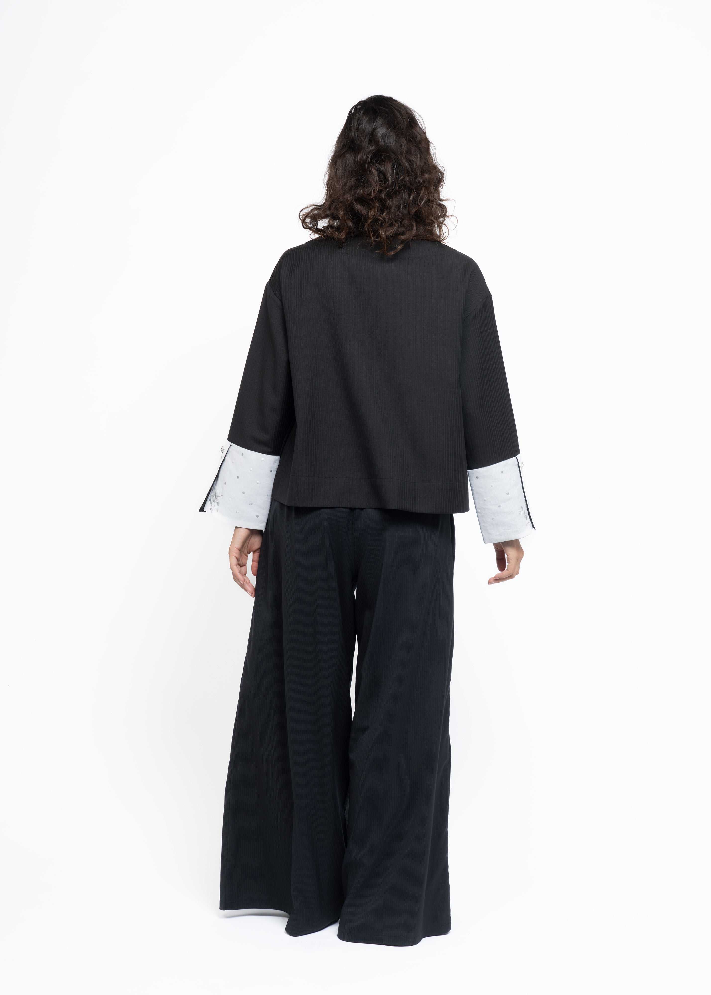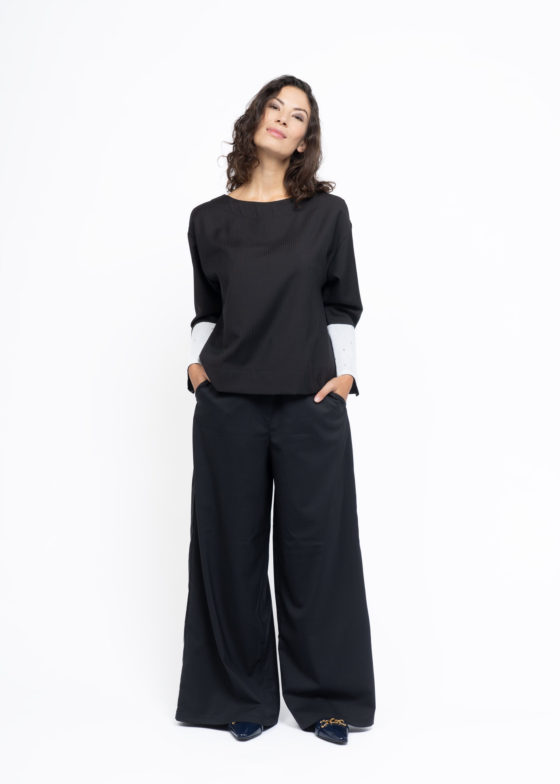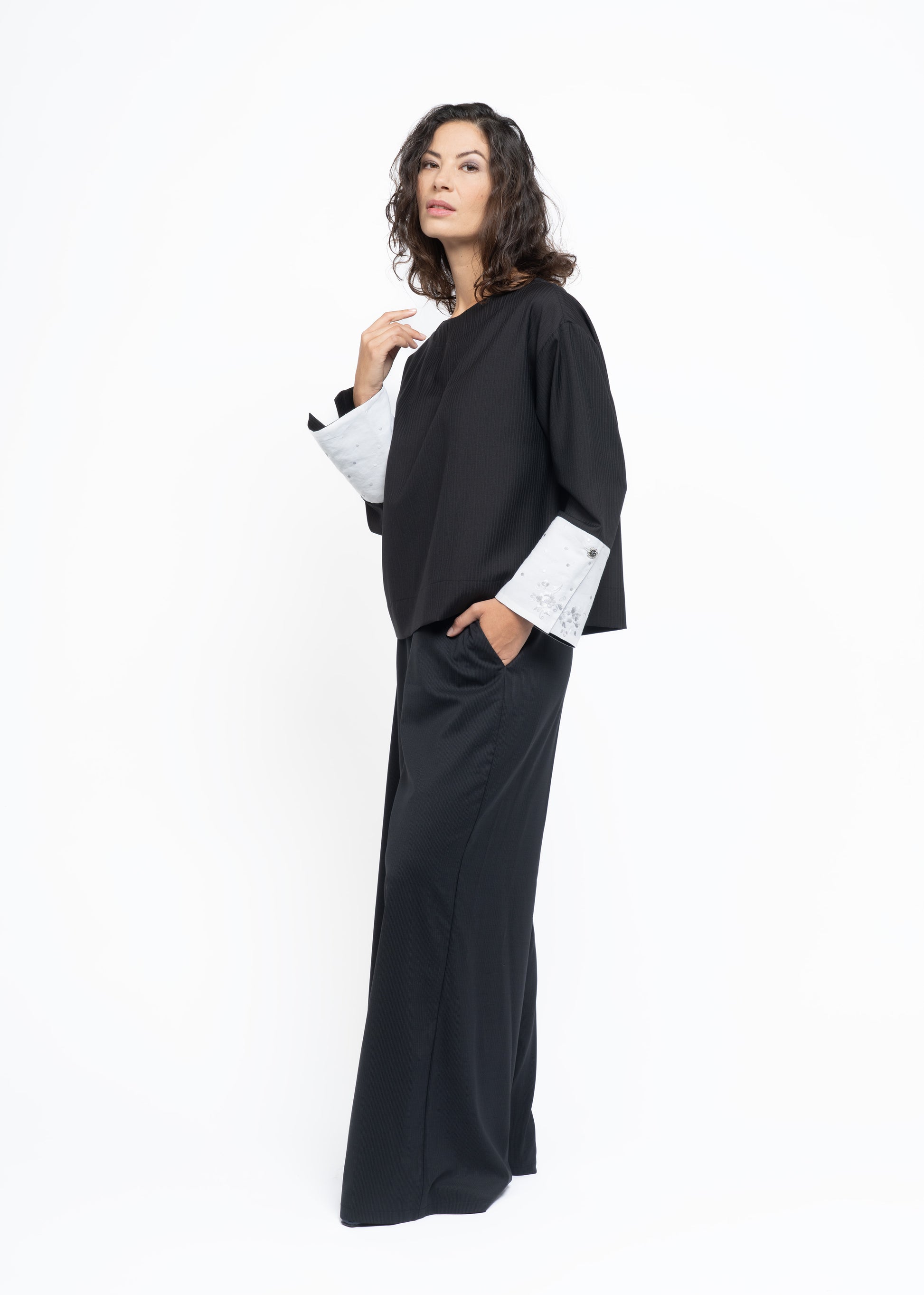 The Antonia Blouse features an elegant round neckline and a classic slip-in silhouette with three-quarter sleeves. Crafted from the finest black wool, this blouse is distinguished by the contrasting cuffs, made from Greek linen adorned with exquisite embroidery from the 1980s.