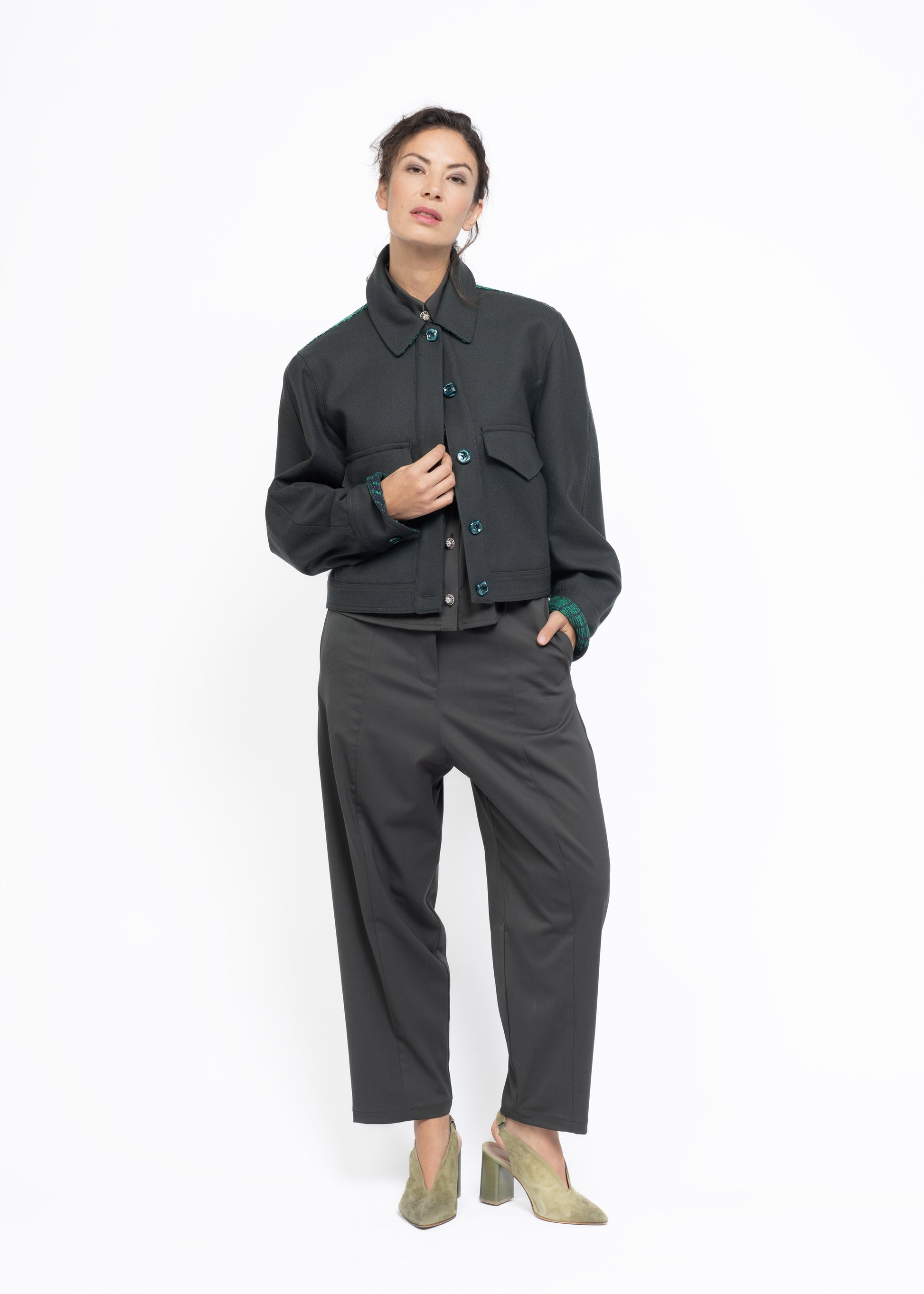 Crafted from french khaki/green wool fabric, this aviation-inspired jacket combines refined materials with thoughtful details. French boucle accents appear on the back, under the collar, and inside the cuffs, while a soft Japanese cotton lining adds subtle luxury. The jacket features a front button closure, long sleeves, and multiple pockets that provide both utility and style. Slightly cropped, it offers a modern, structured silhouette perfect for layering or wearing on its own.