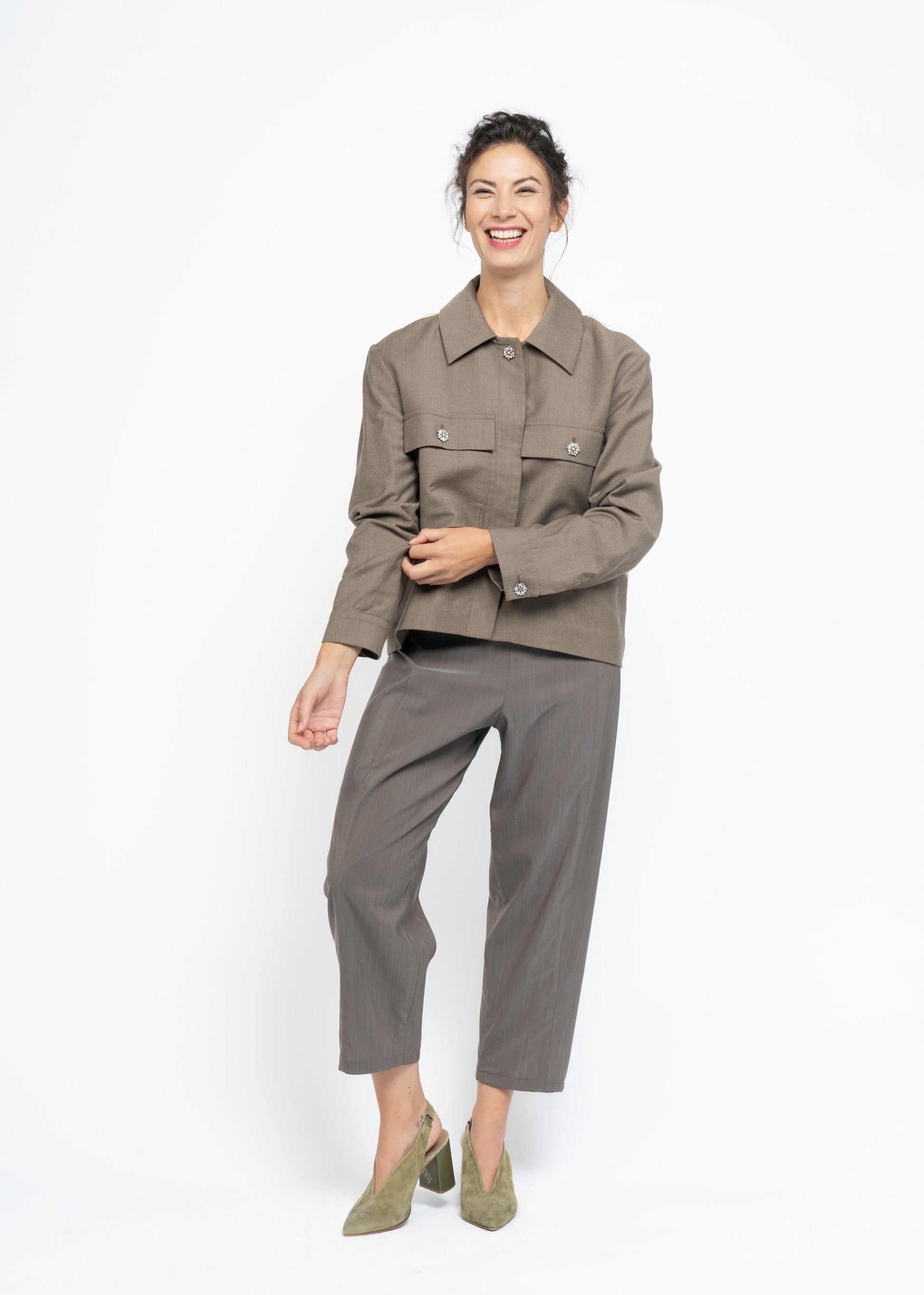 This "Her Easy Jacket" is crafted from the finest French lightweight wool in a subtle mushroom brown and paired with vibrant Greek cotton featuring beautiful embroidery on the back. The intricate details introduce a touch of maximalism to the minimalist design, achieving a perfect balance between contrasting styles.