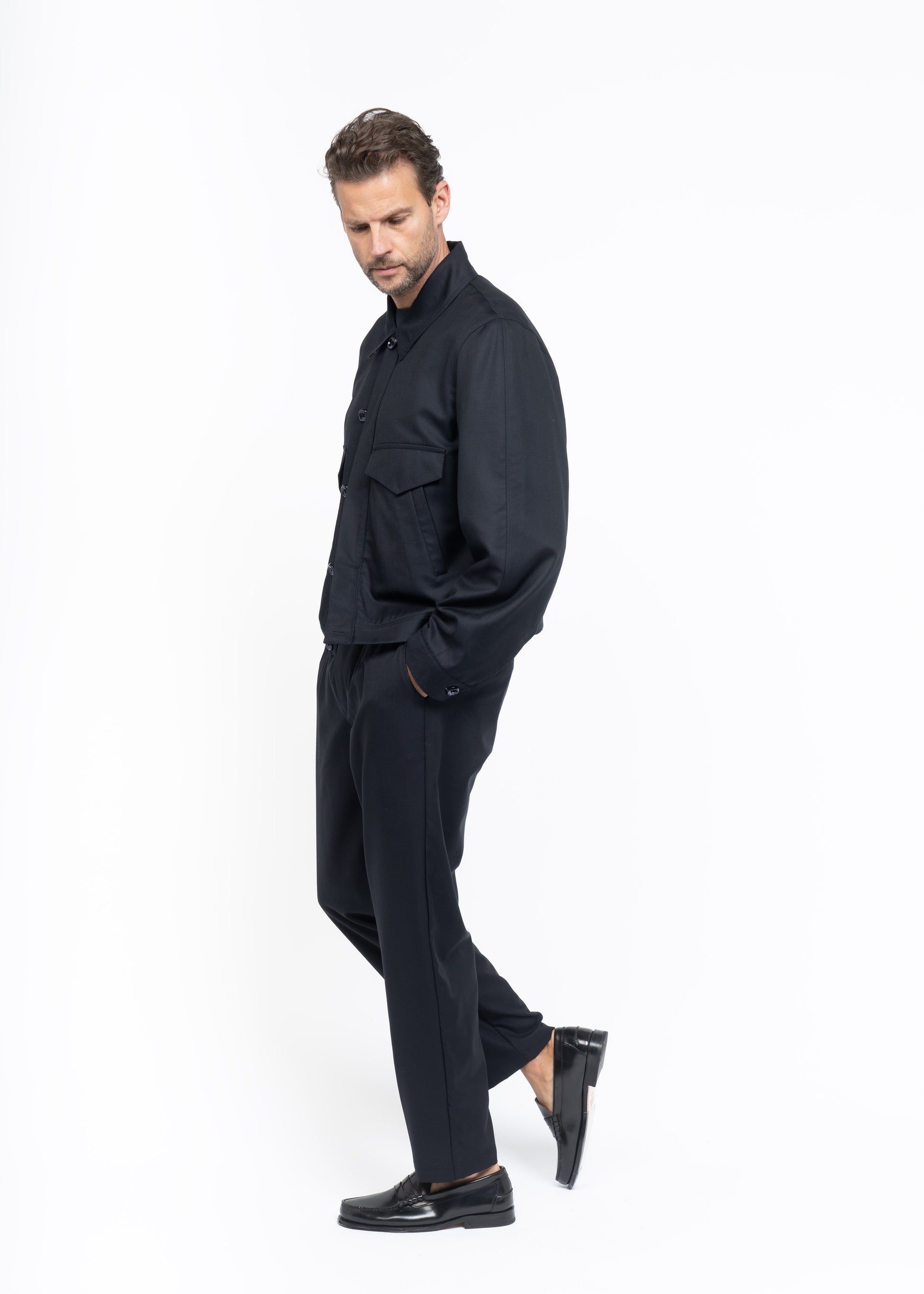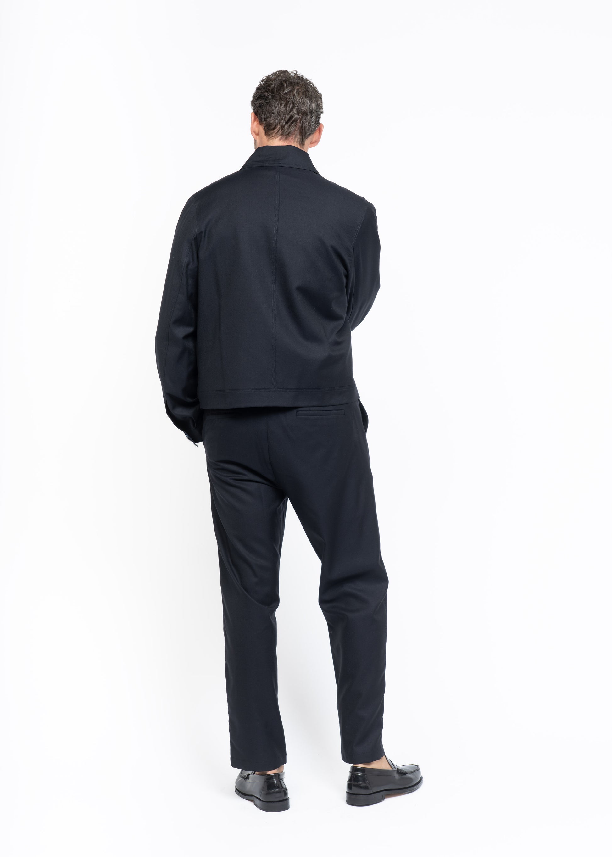 Crafted from french lightweight dark blue wool, this aviation-inspired jacket combines refined materials with thoughtful detailing. Japanese cotton accents appear beneath the collar, inside the cuffs, and along the lining, adding a touch of understated luxury. The jacket features a front button closure, long sleeves, and multiple pockets that provide both functionality and style. Slightly cropped, it offers a modern, structured silhouette—perfect for layering or wearing on its own.