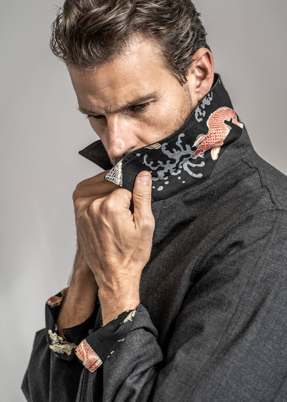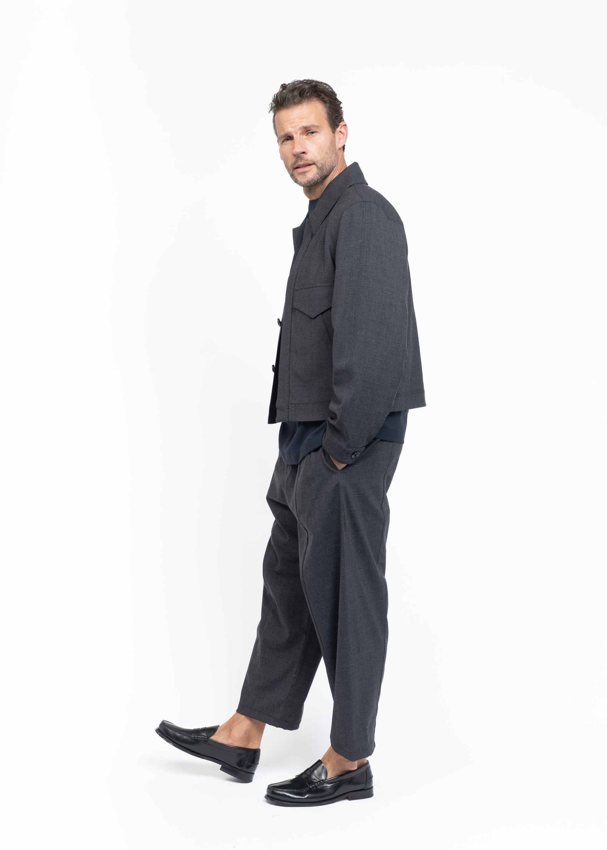 Crafted from french lightweight grey wool, this aviation-inspired jacket combines refined materials with thoughtful detailing. Japanese cotton accents appear beneath the collar, inside the cuffs, and along the lining, adding a touch of understated luxury. The jacket features a front button closure, long sleeves, and multiple pockets that provide both functionality and style. Slightly cropped, it offers a modern, structured silhouette—perfect for layering or wearing on its own.