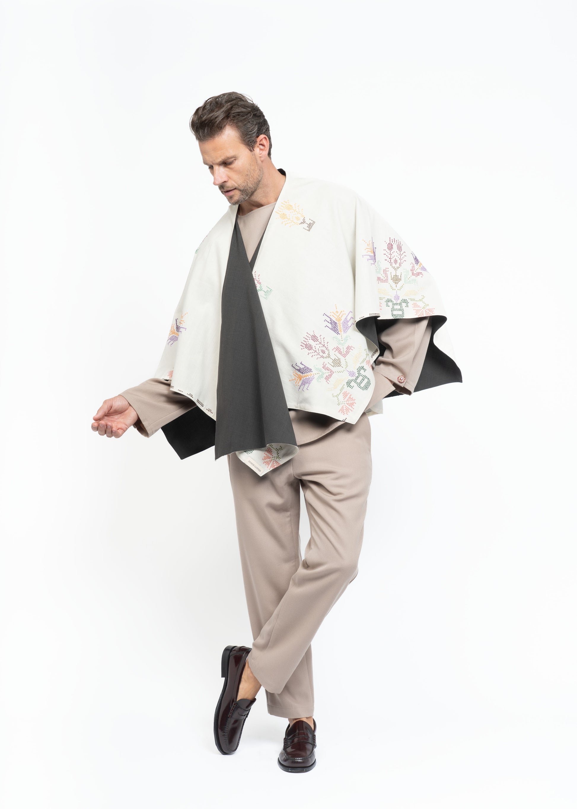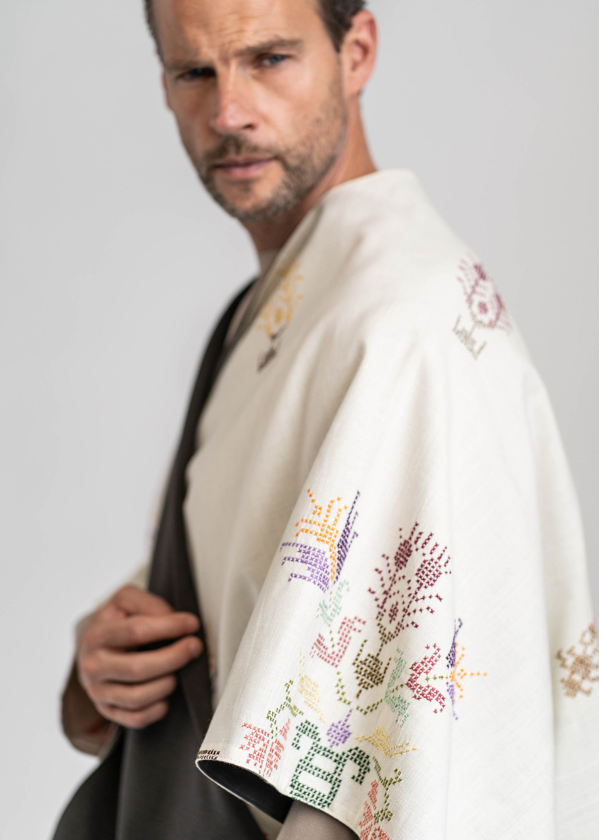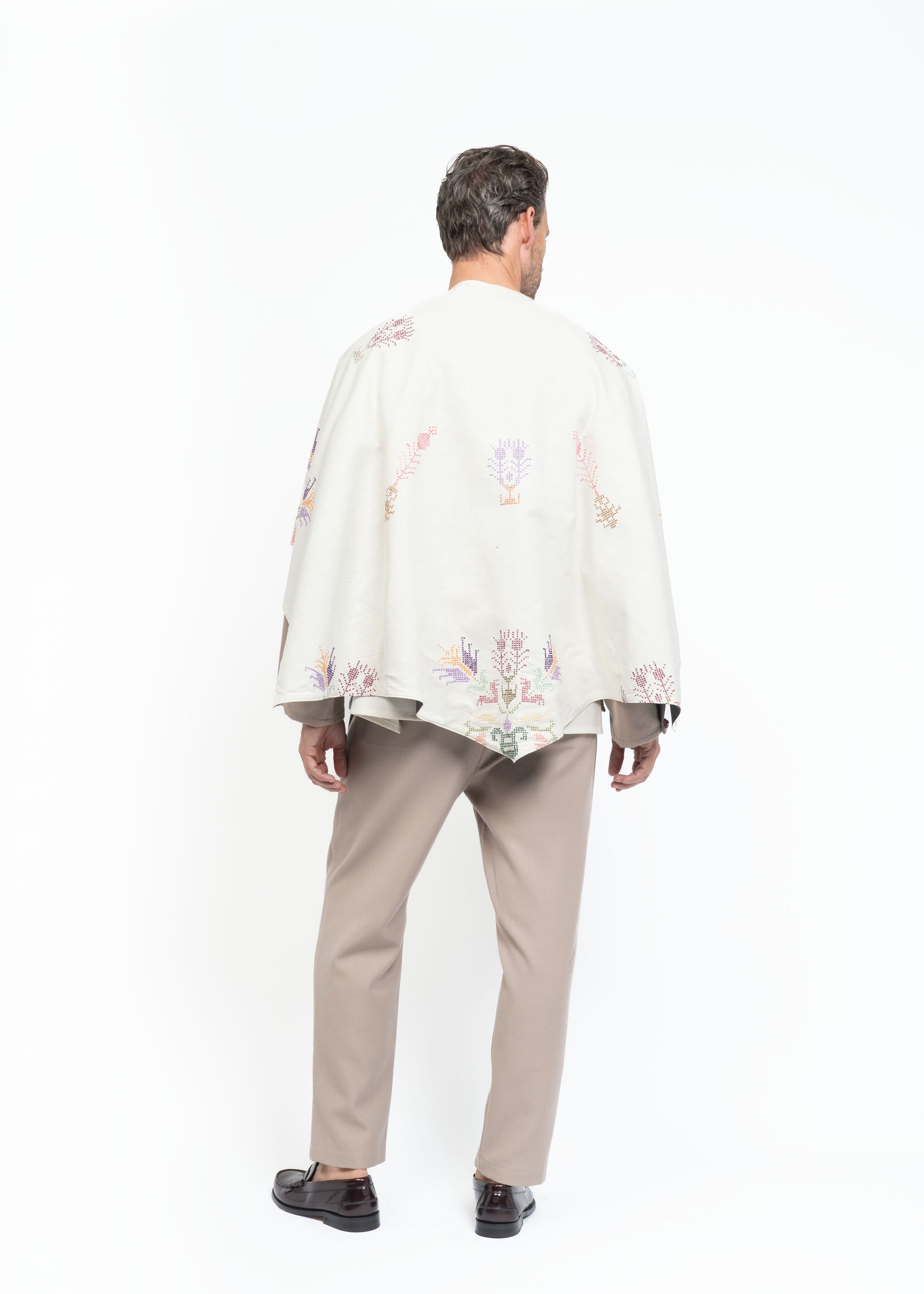 This mantle is crafted from two exceptional fabrics. On one side, lightweight French wool in a sophisticated brown tone, and on the other, Greek hand-embroidered cotton dating back to the 1980s. These contrasting materials come together to create a unique, timeless piece that honors heritage while embodying modern elegance.