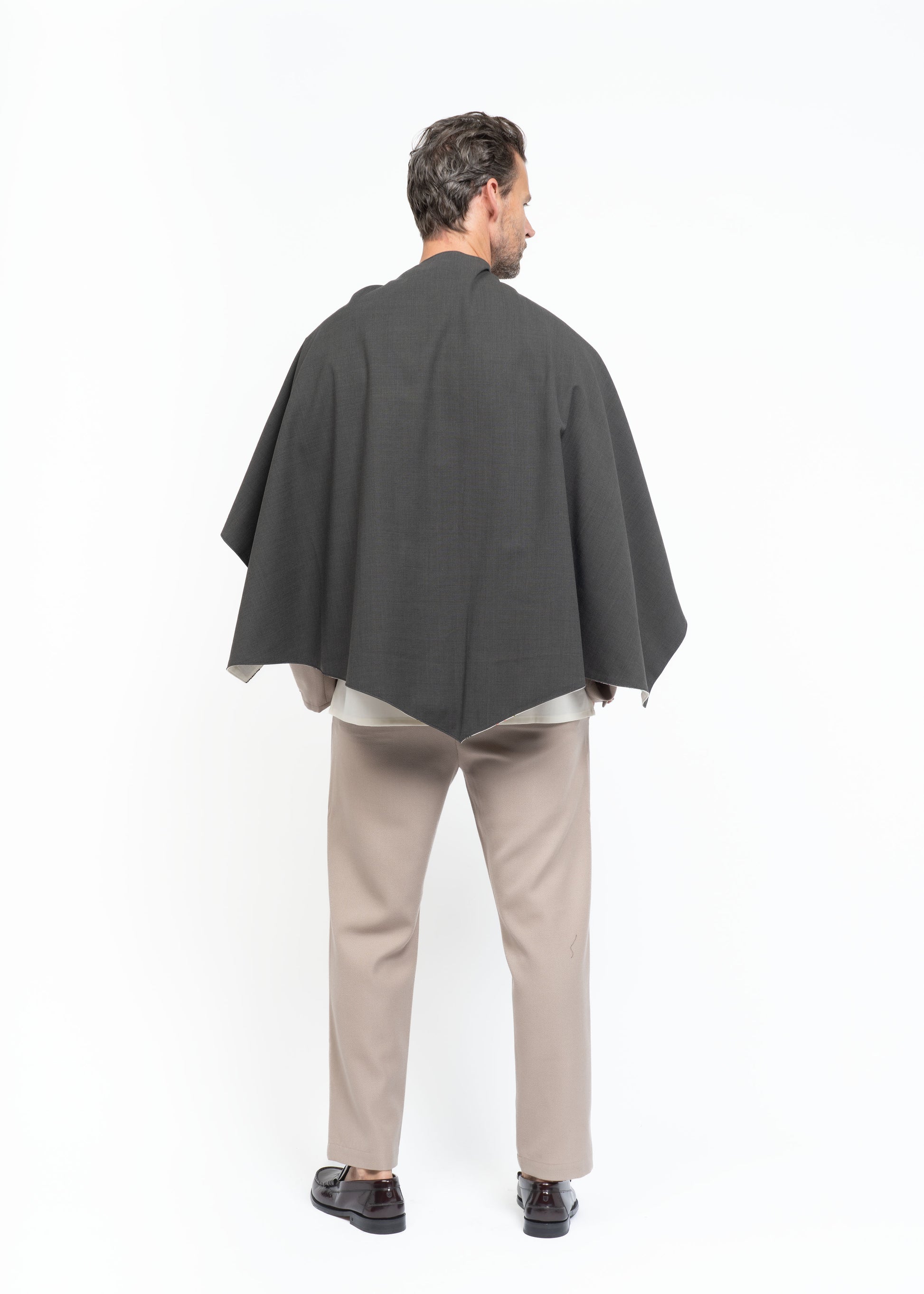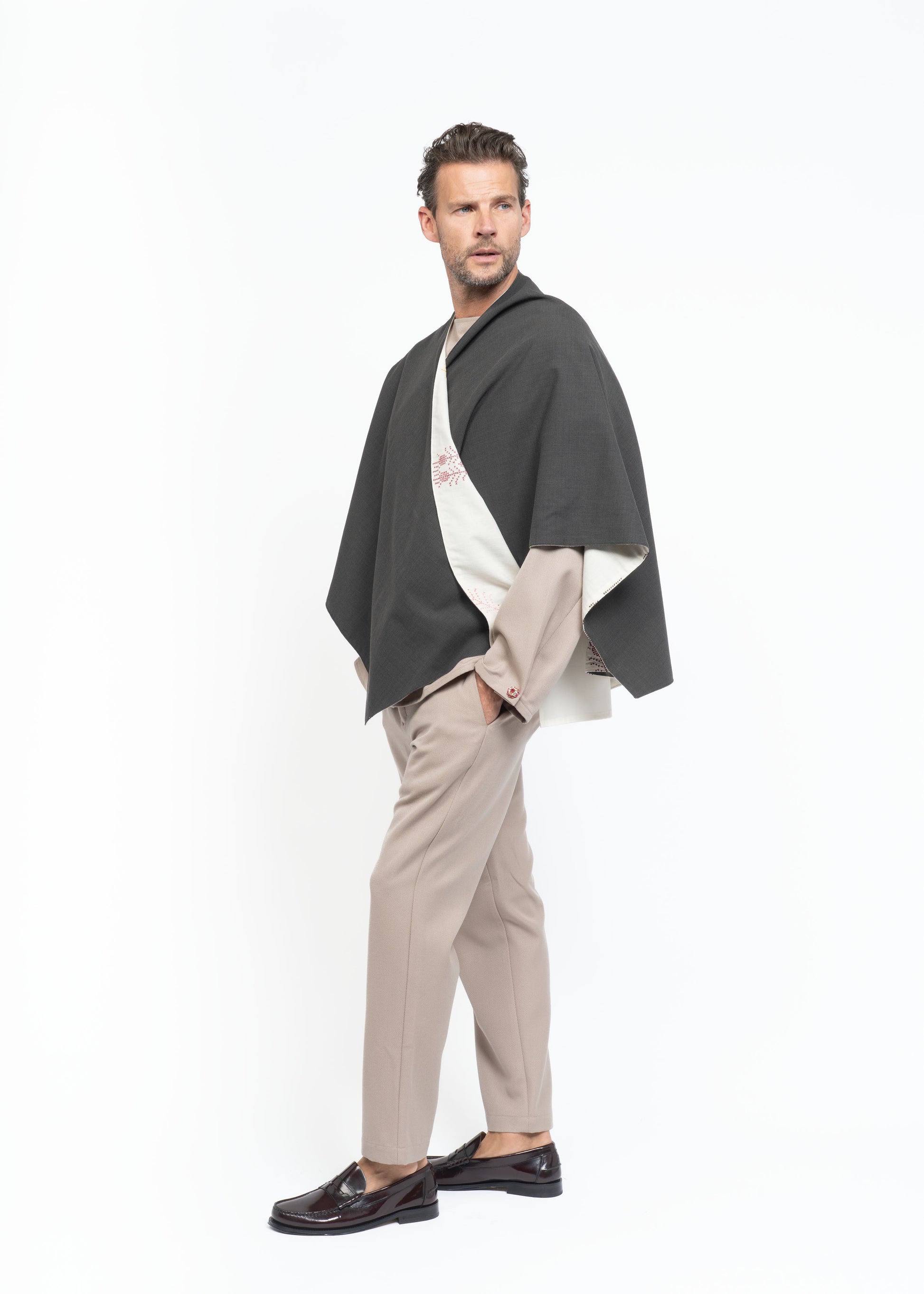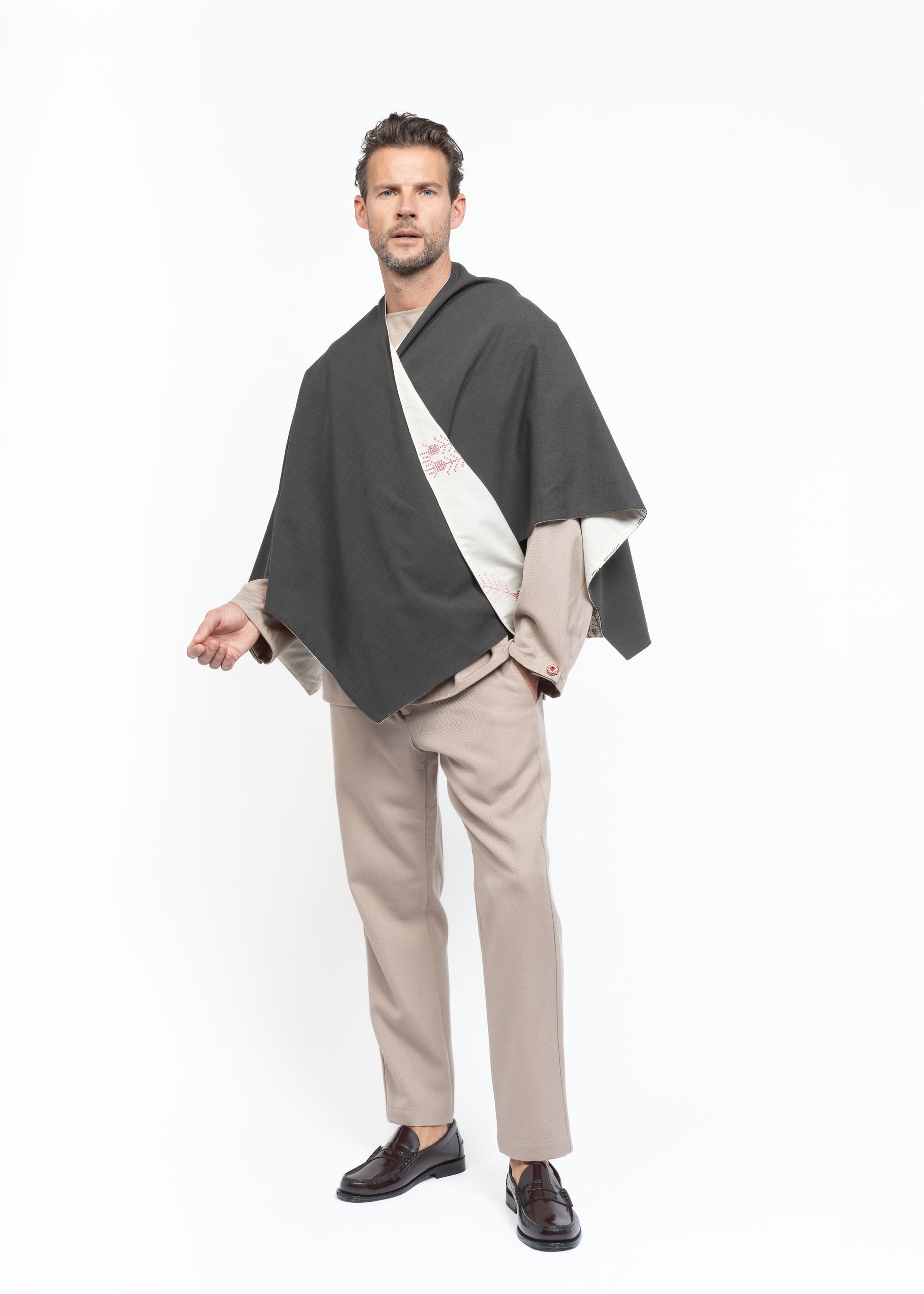 This mantle is crafted from two exceptional fabrics. On one side, lightweight French wool in a sophisticated brown tone, and on the other, Greek hand-embroidered cotton dating back to the 1980s. These contrasting materials come together to create a unique, timeless piece that honors heritage while embodying modern elegance.