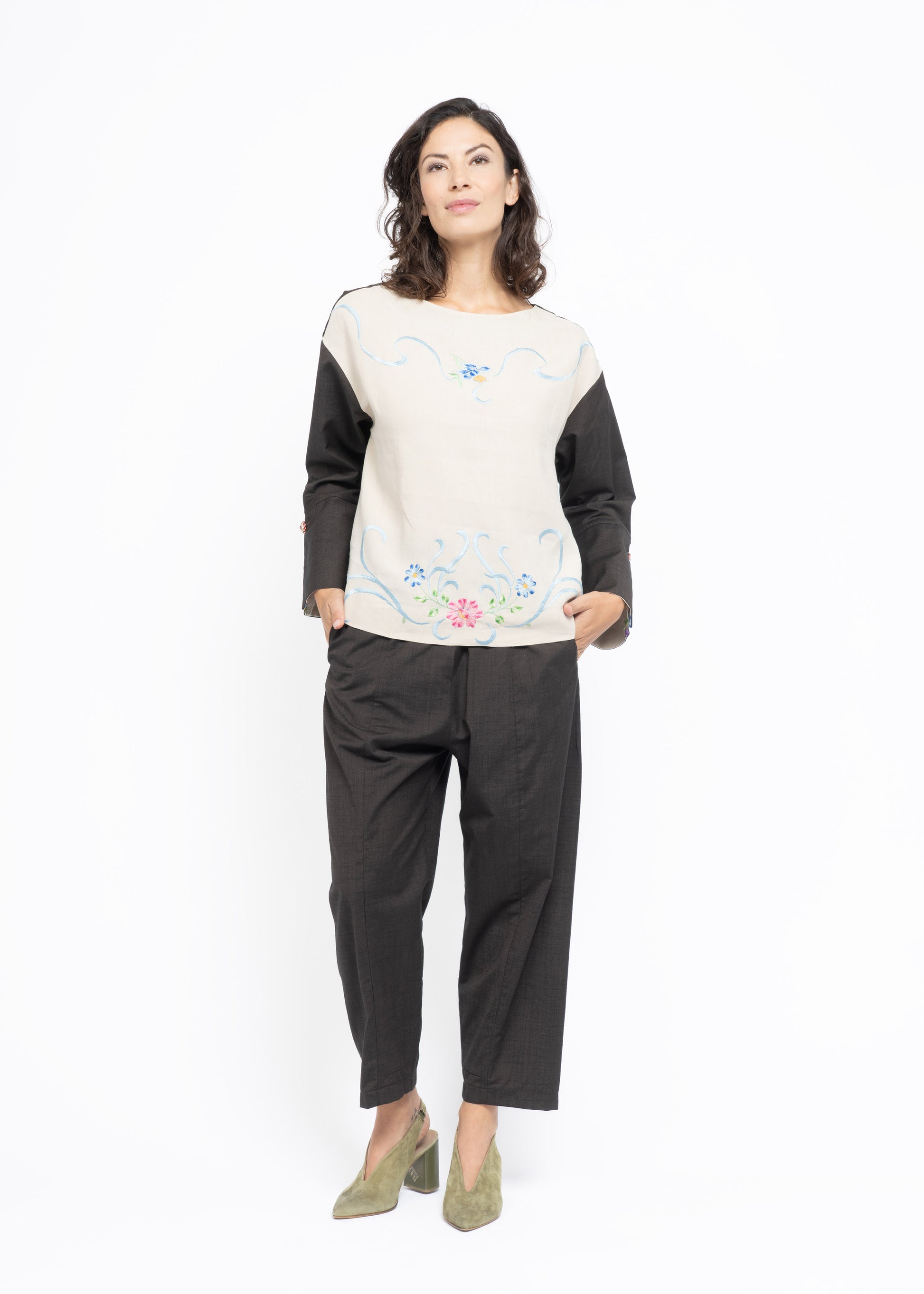 Made from the finest wool in a rich brown tone, this blouse features a truly unique front panel crafted from beautifully embroidered Greek cotton, adorned with colorful floral motifs that also appear on the inner side of the cuffs. The intricate embroidery creates a striking and elegant focal point.