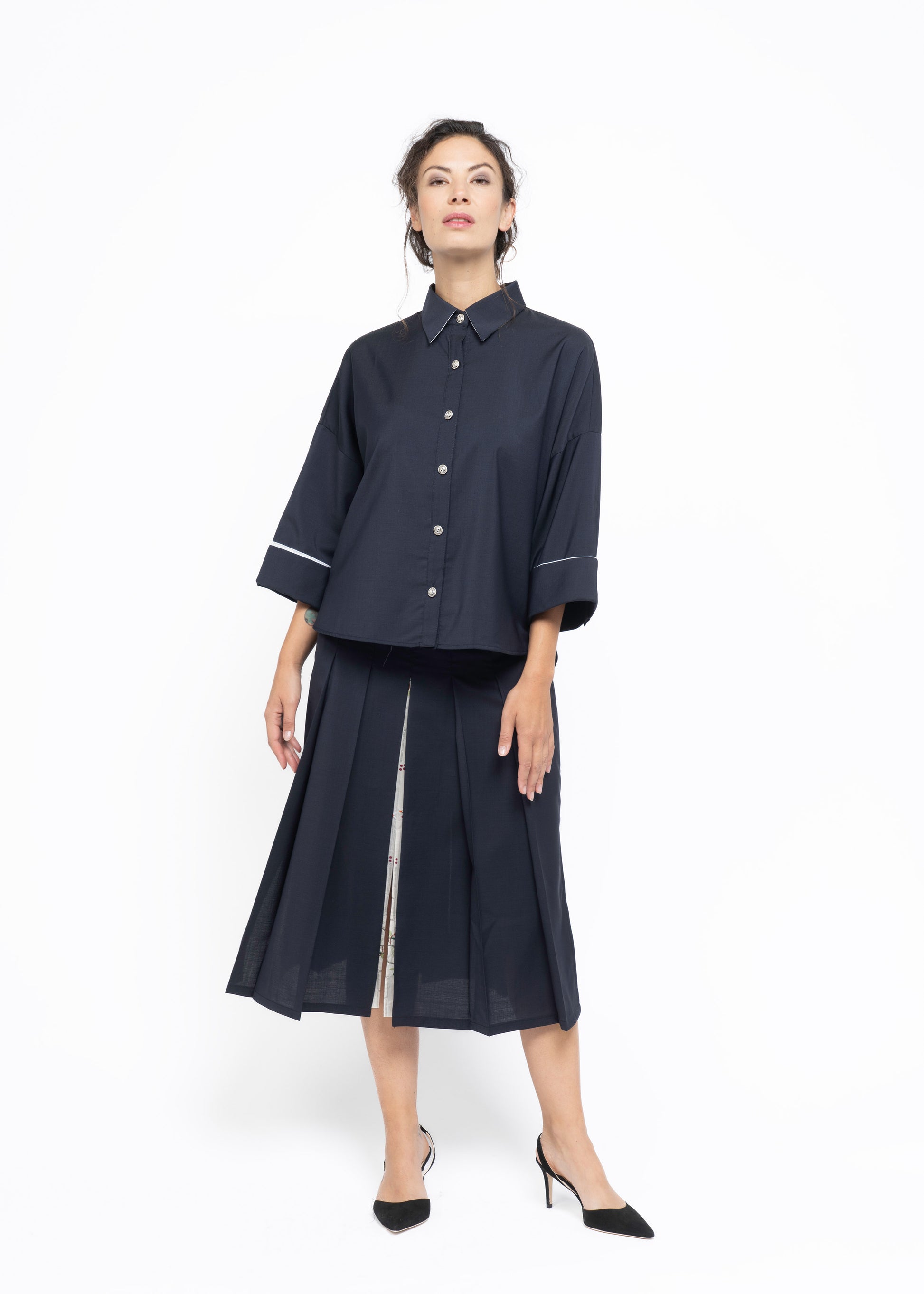 This dark blue lightweight wool shirt is designed with details that you can choose to reveal or keep private. Hidden treasures in the inner cuffs, beneath the collar, and within the discreet back pleat make this shirt a true jewel, crafted to bring joy to its wearer.