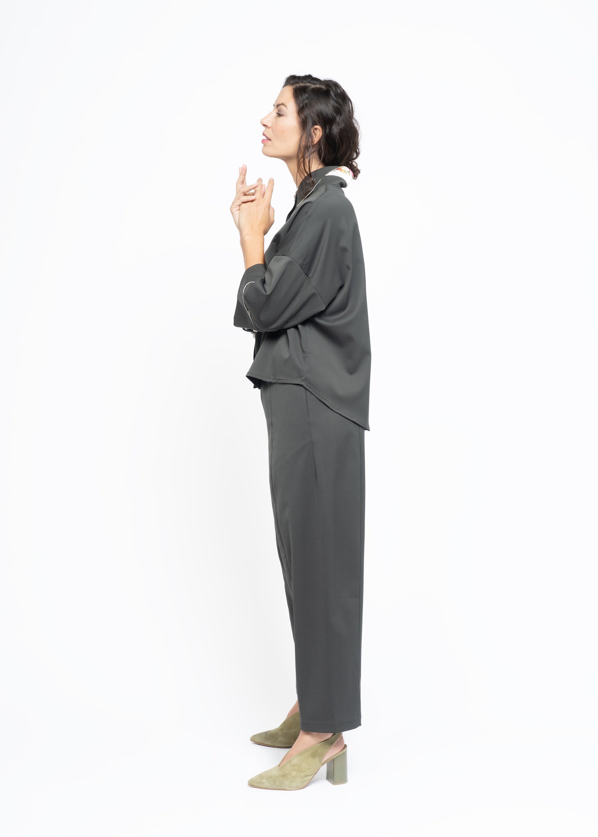 This khaki lightweight wool shirt is designed with details that you can choose to reveal or keep private. Hidden treasures in the inner cuffs, beneath the collar, and within the discreet back pleat make this shirt a true jewel, crafted to bring joy to its wearer.