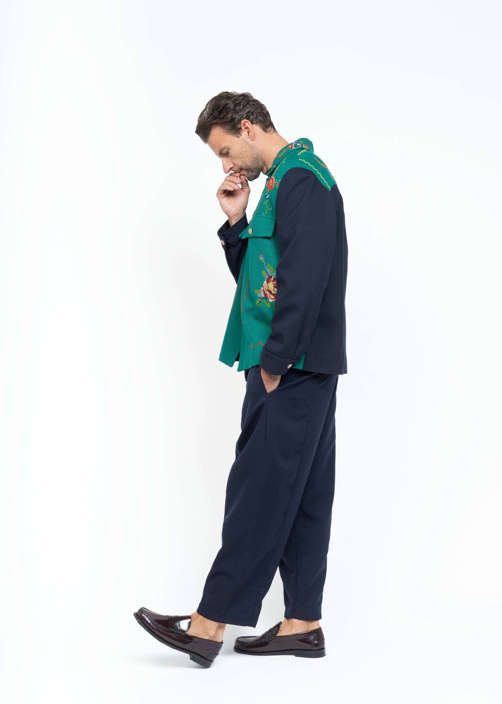 This “Easy Jacket” is crafted from Greek hand-embroidered cotton featuring intricate floral motifs on the front, masterfully paired with luxurious French wool in a deep dark blue tone. The cotton lining enhances the distinct character of this one-of-a-kind piece, while carefully selected buttons add a subtle touch of maximalism to its minimalist design—striking a perfect balance between heritage craftsmanship and contemporary refinement.