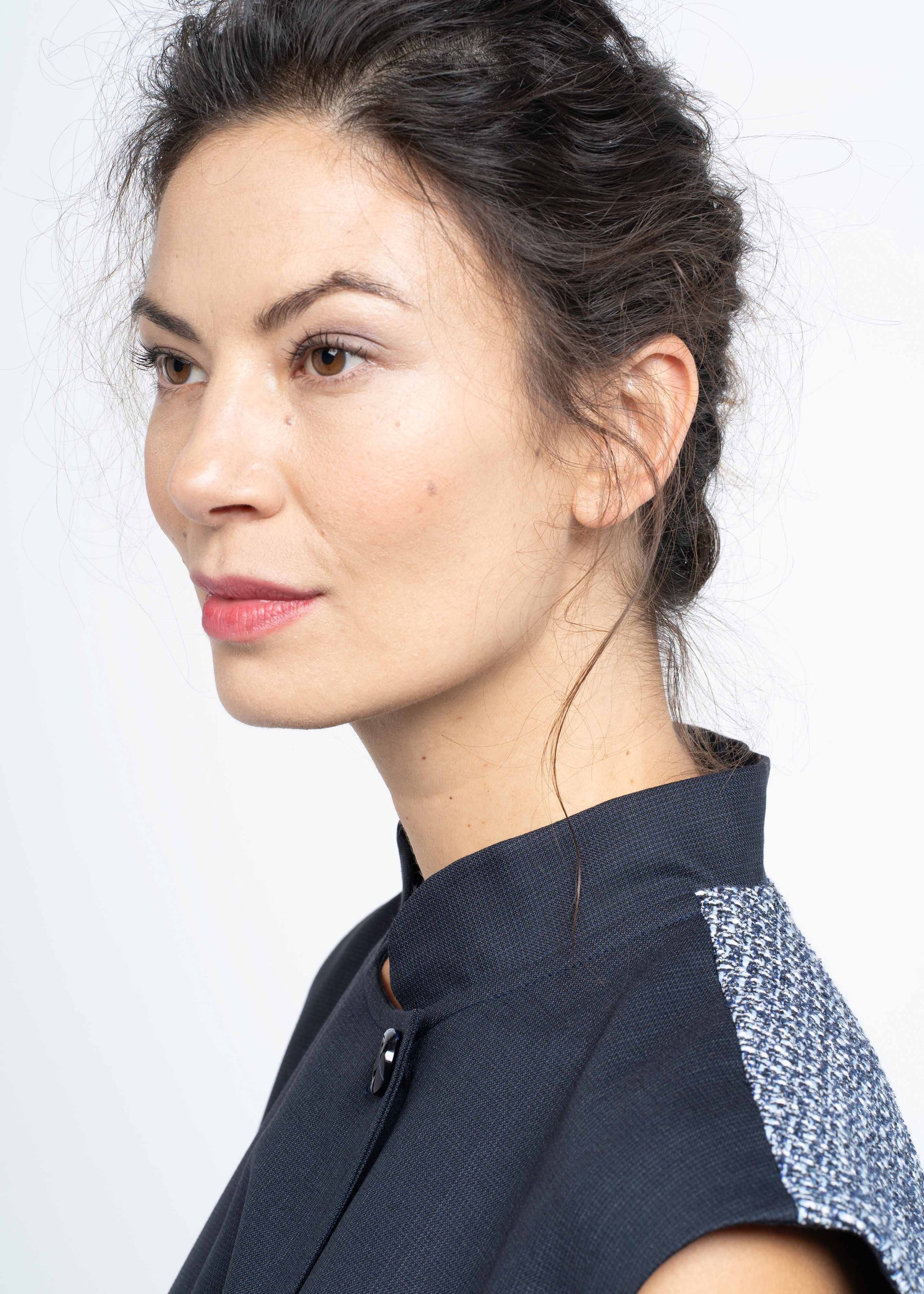 This sleeveless design impresses with its elegant A-line silhouette and the exquisite combination of fabrics. Finest French dark blue wool is paired with luxurious French boucle, creating a timeless piece that can be worn in versatile ways.