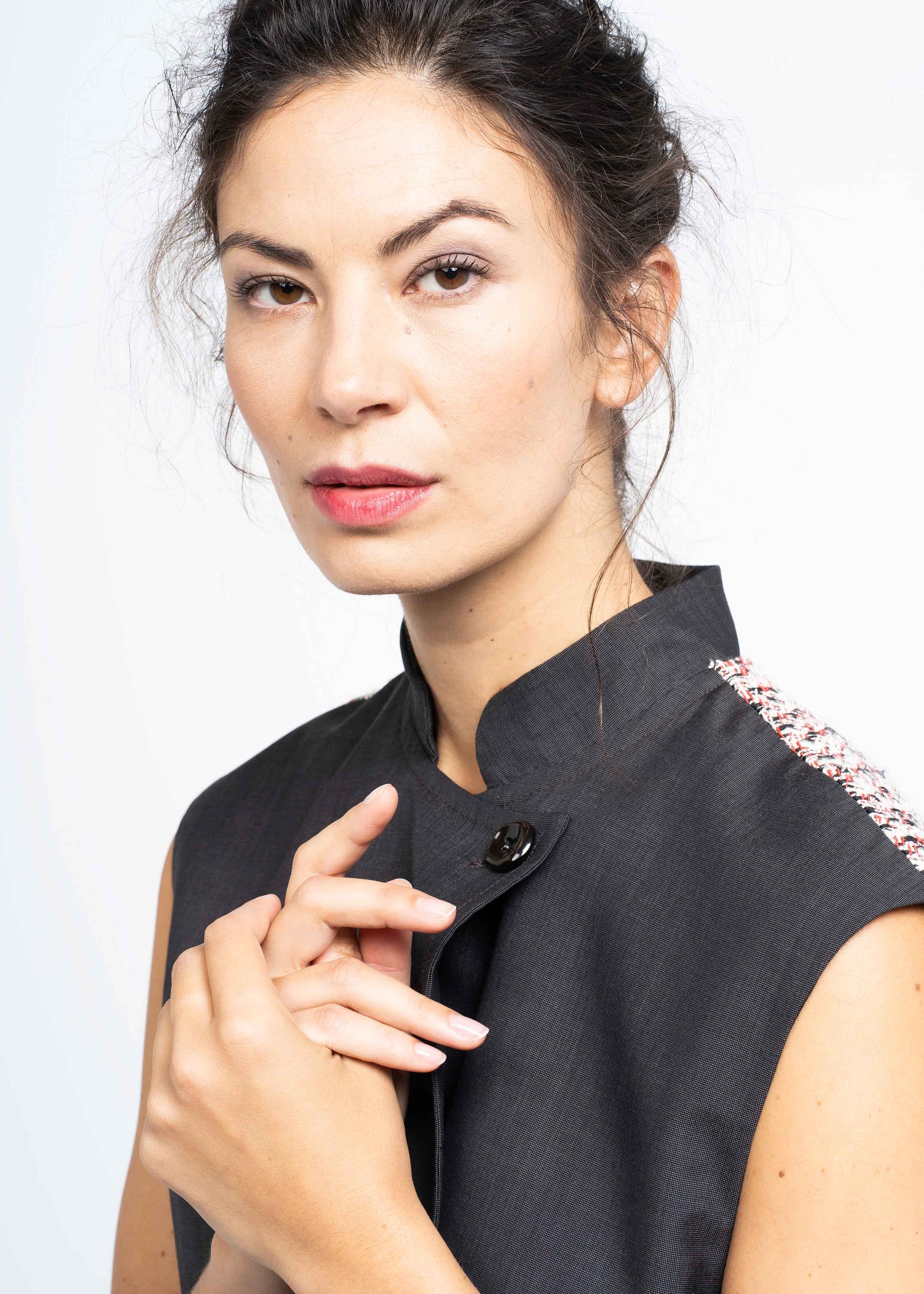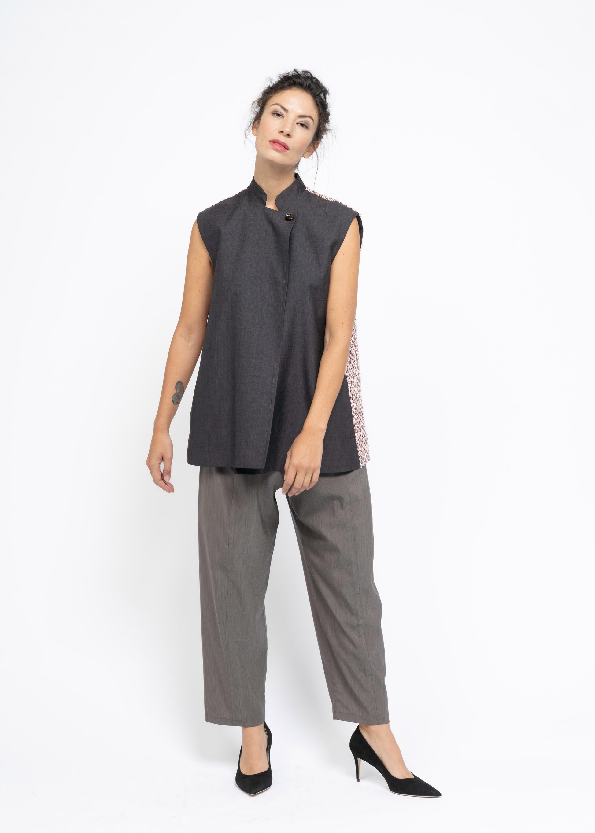 This sleeveless gilet features an elegant A-line silhouette and a refined combination of fabrics. Crafted from the finest French dark brown wool and paired with luxurious French boucle, it creates a timeless piece suitable for versatile styling.