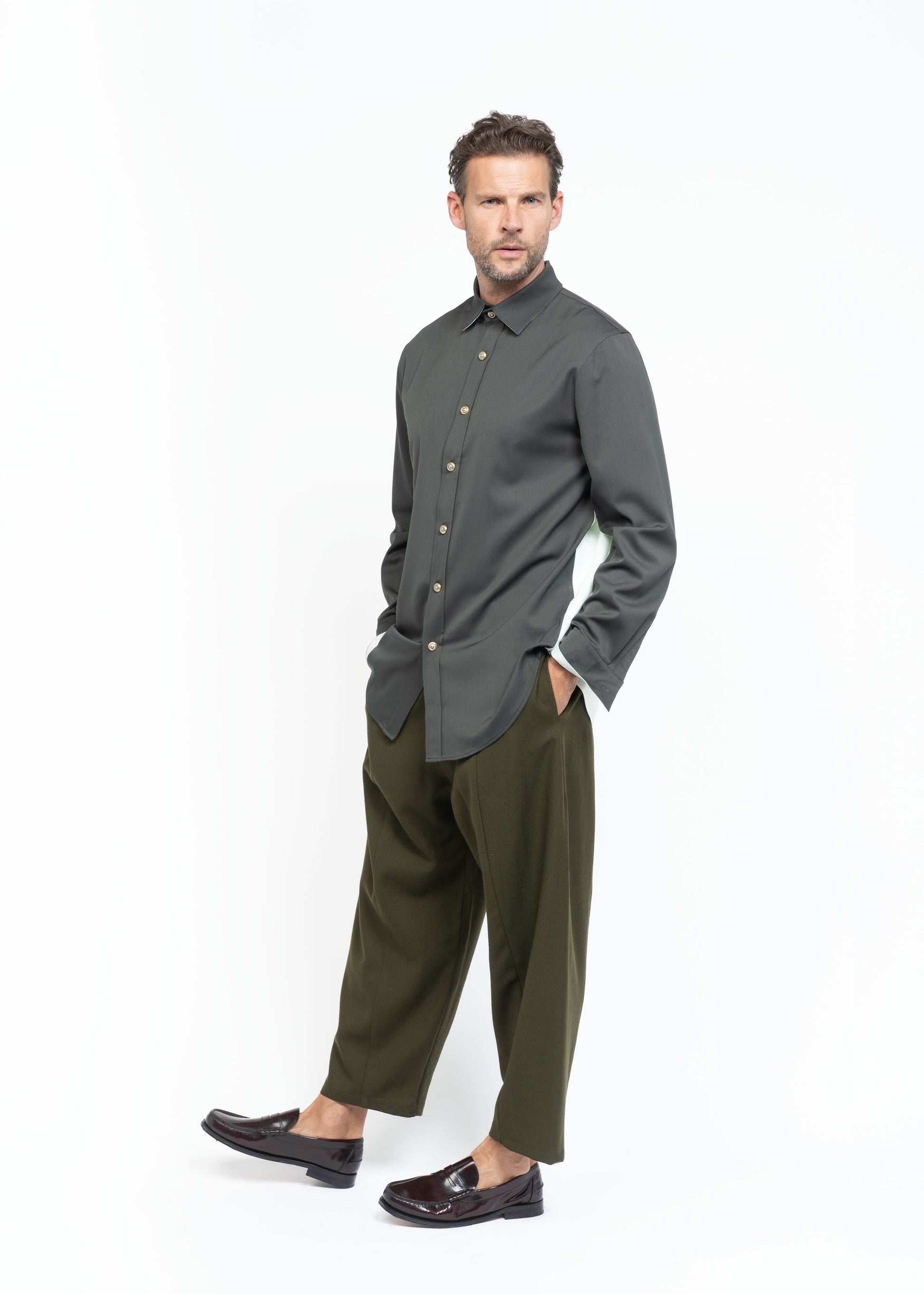 This shirt combines the sophistication of fine French lightweight wool in khaki on the front with light green Greek linen on the back, under the collar, and inside the cuffs — exquisitely embroidered. Carefully selected buttons complete the design, adding a subtle touch of refinement. A timeless piece that harmoniously balances craftsmanship, comfort, and understated elegance.