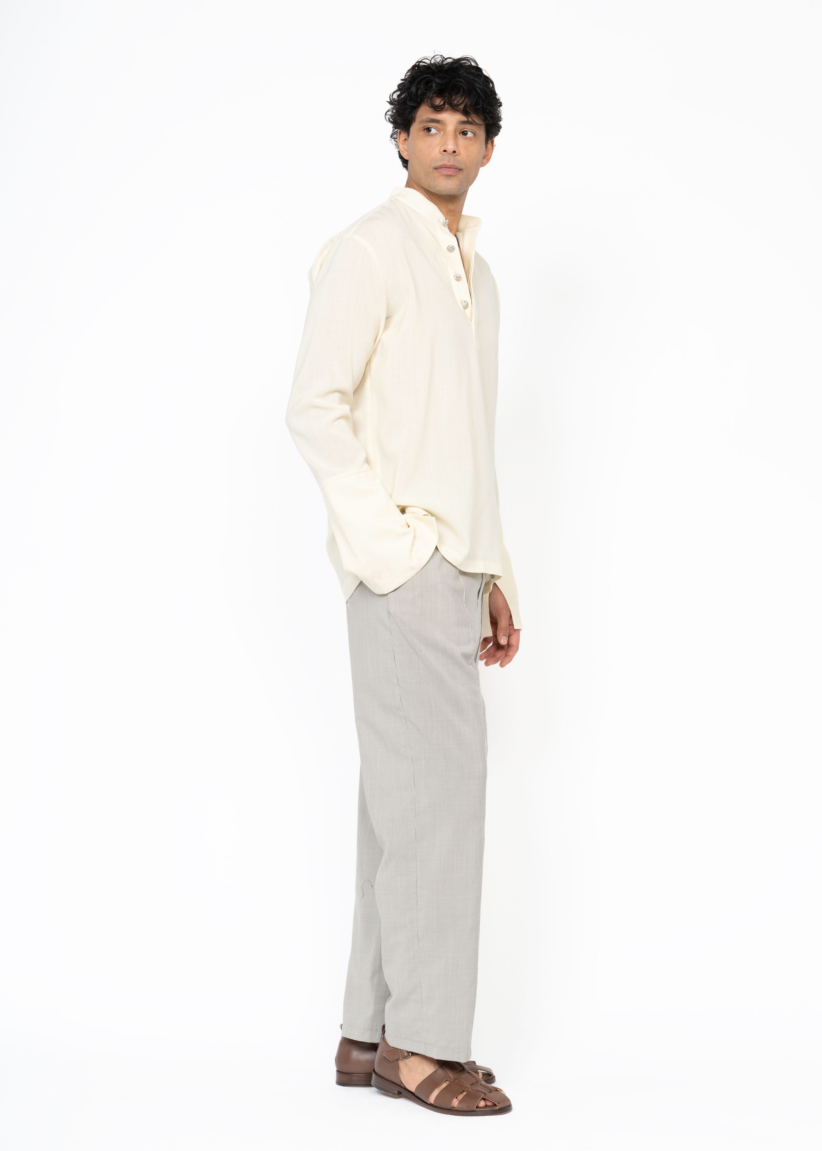 Crafted from the finest French wool, The Long Cuffs Shirt combines minimalism with refined detail. Its extended cuffs are lined with beautifully embroidered Greek cotton, revealed when rolled up for a distinctive and sophisticated touch. Worn down, the look remains clean and understated.