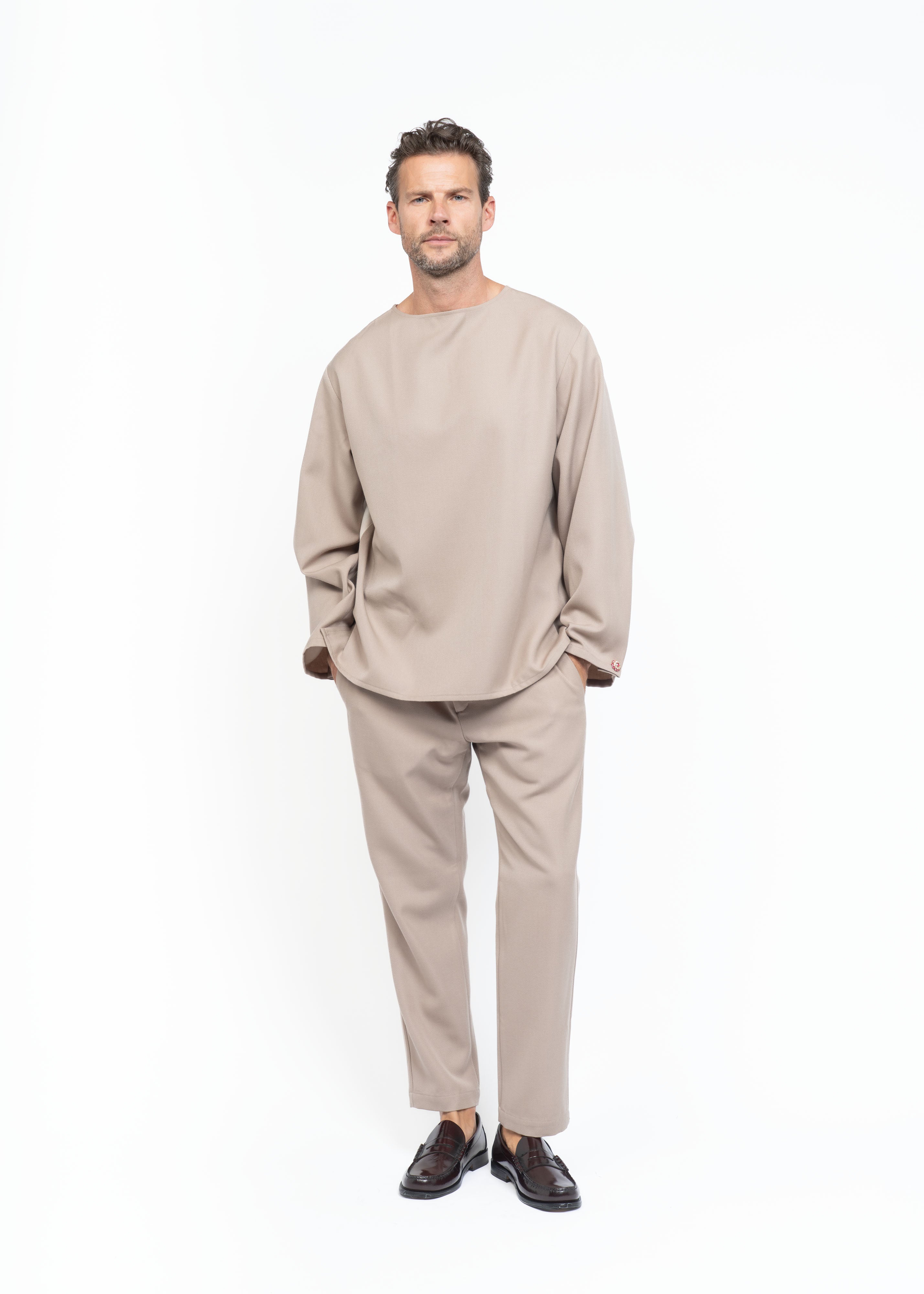 The One of One "The Long Sleeve Shirt Wool” is made of French wool in a beautiful mushroom brown tone and combined with off-white Italian mohair on the back. It embodies a contemporary yet timeless aesthetic, defined by simplicity and quiet splendor.