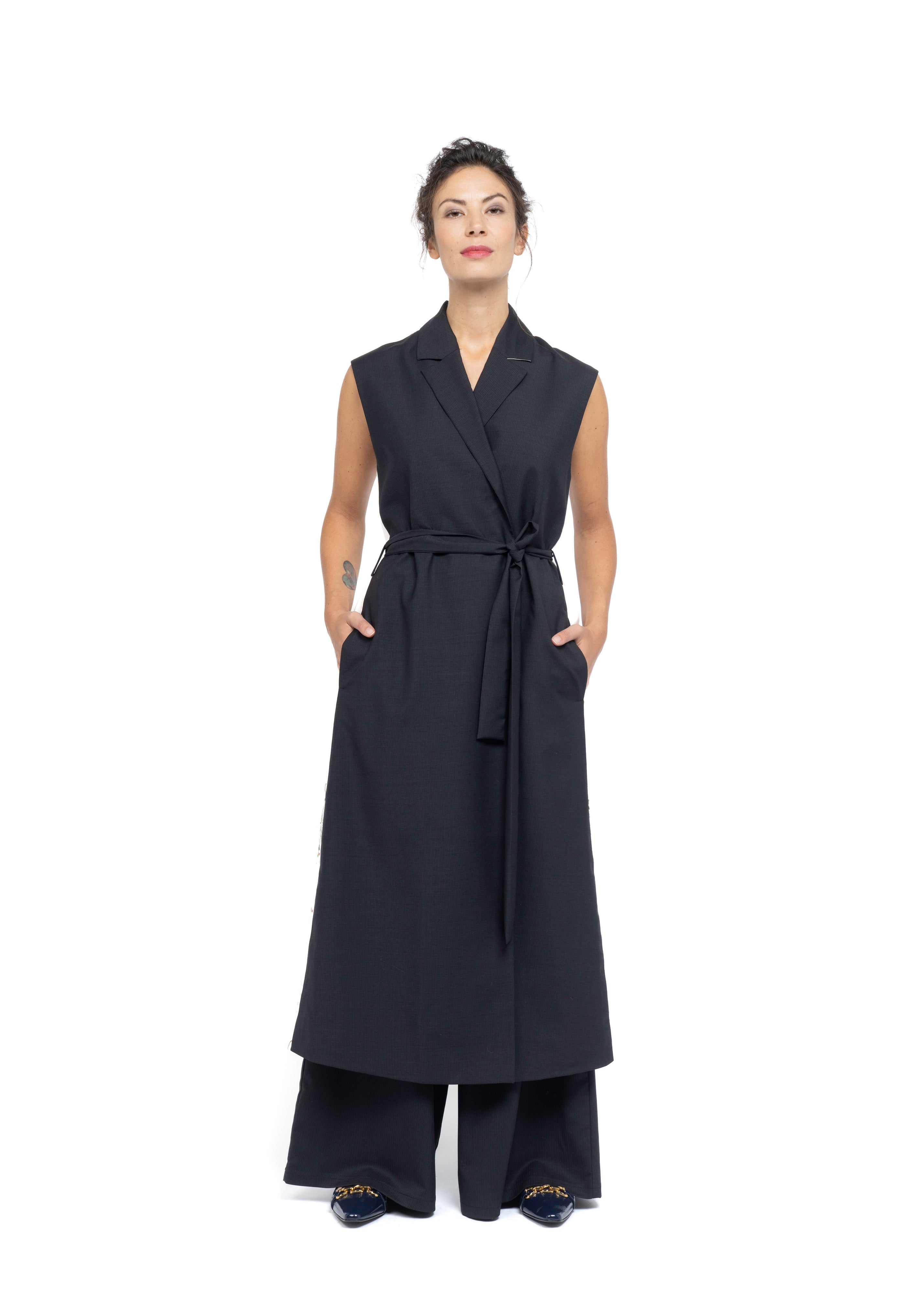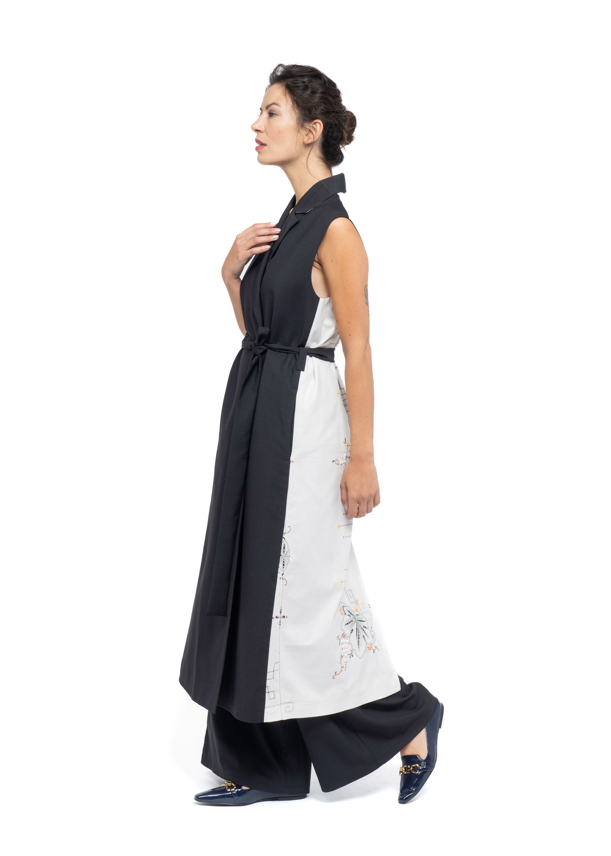 This sleeveless coat is a timeless, versatile piece designed to enrich your wardrobe for years to come. Crafted from the finest French dark grey wool, it is beautifully accented with Greek cotton featuring exquisite, colorful embroidery on a crisp white background, creating a striking and elegant focal point.