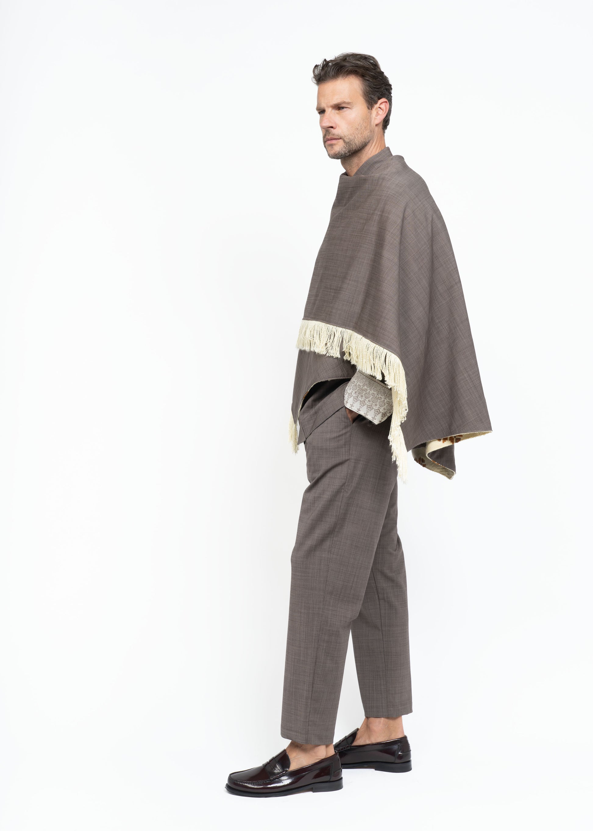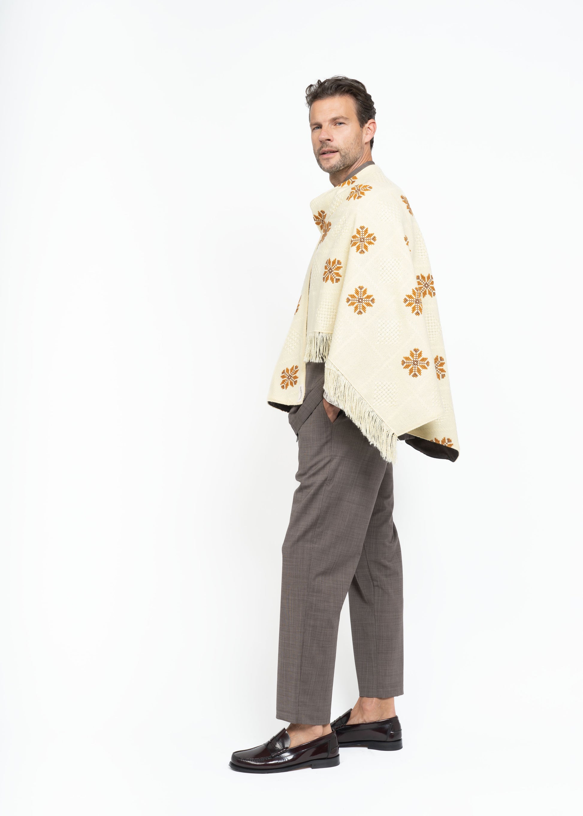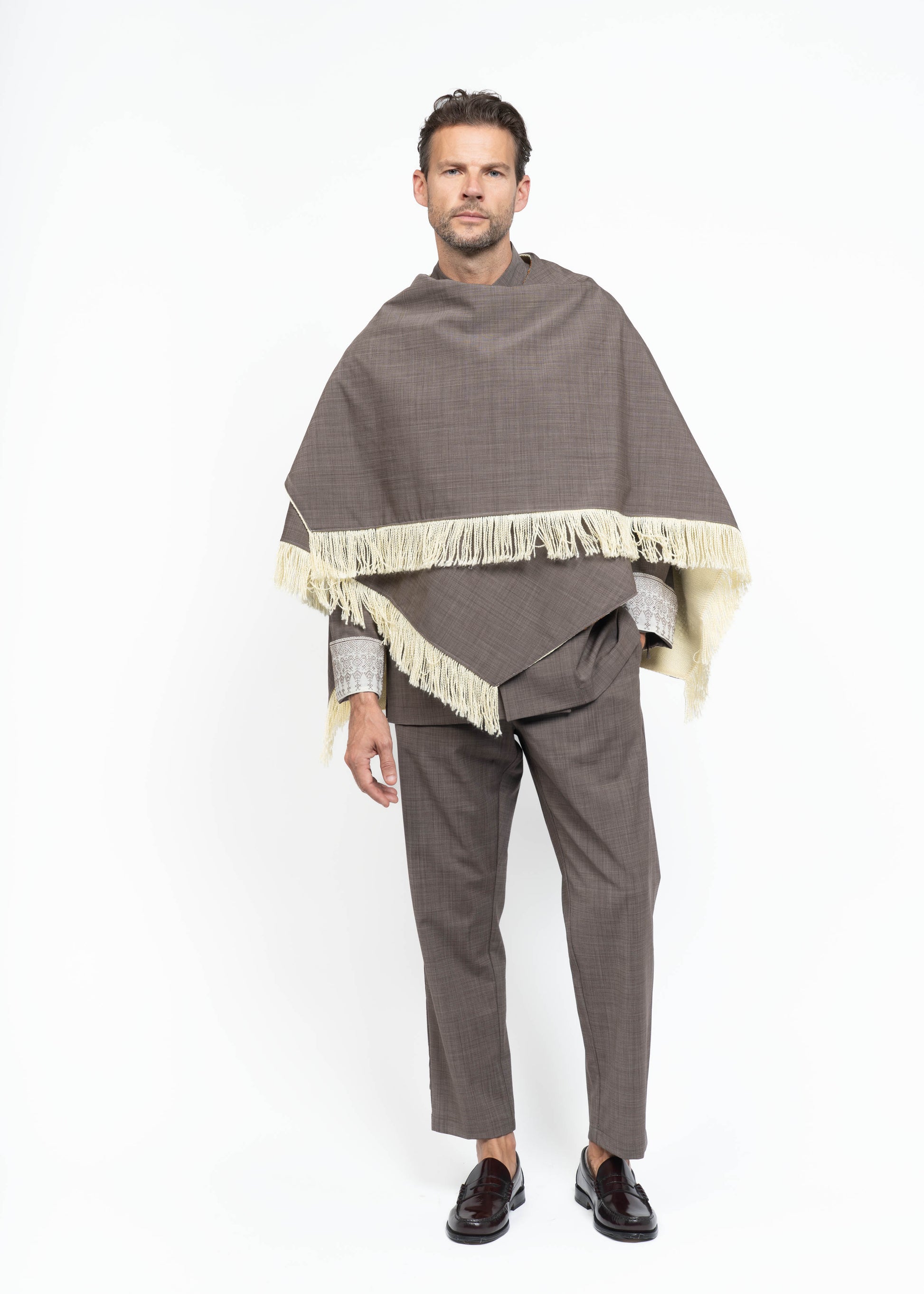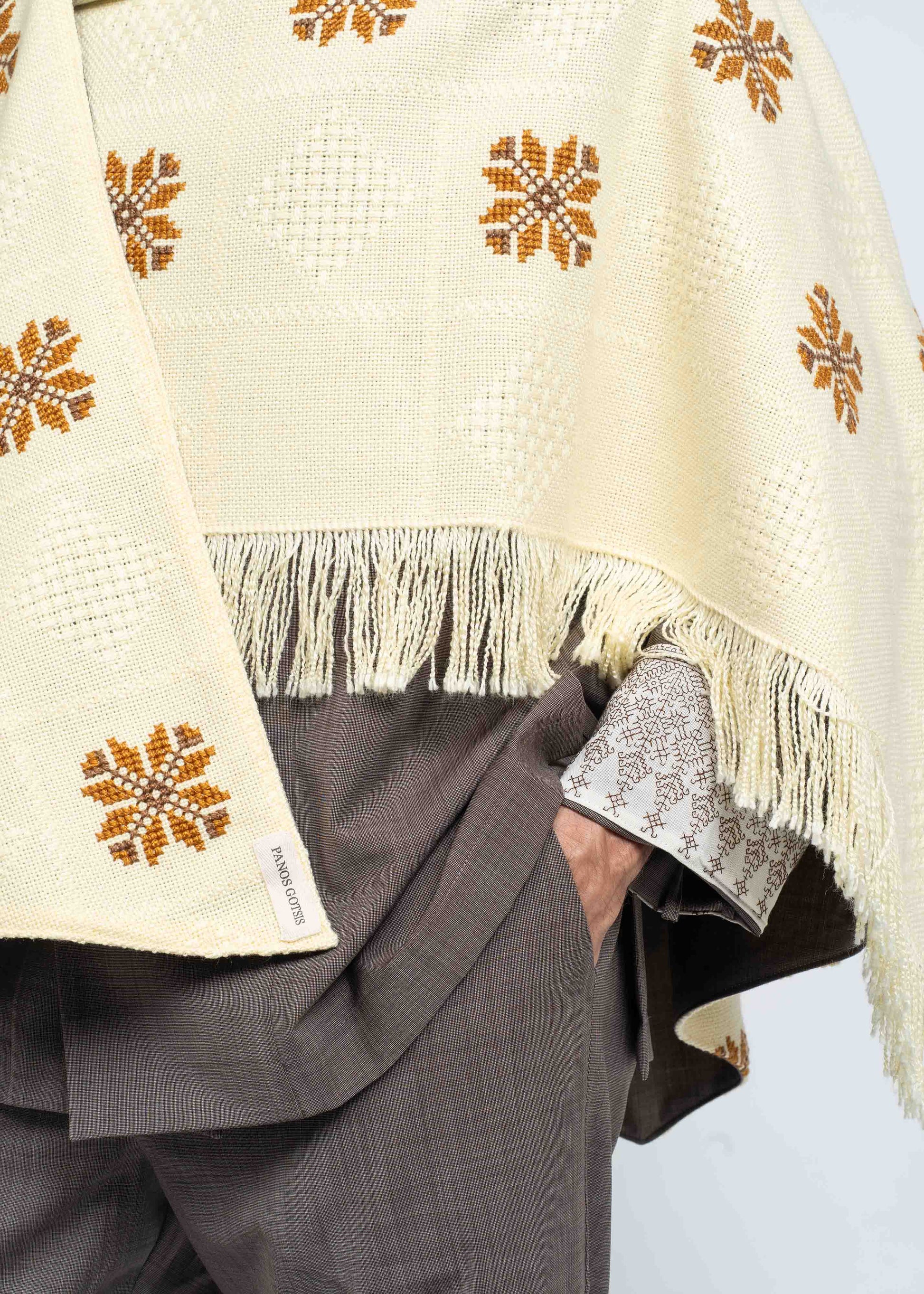 This mantle is crafted from two exceptional fabrics. On one side, lightweight French wool in a sophisticated brown tone, and on the other, Greek embroidered cotton dating back to the 1970s. These contrasting materials come together to create a unique, timeless piece that honors heritage while embodying modern elegance. The fringes from the original fabric emphasize the refined style while adding a playful sense of lightness.