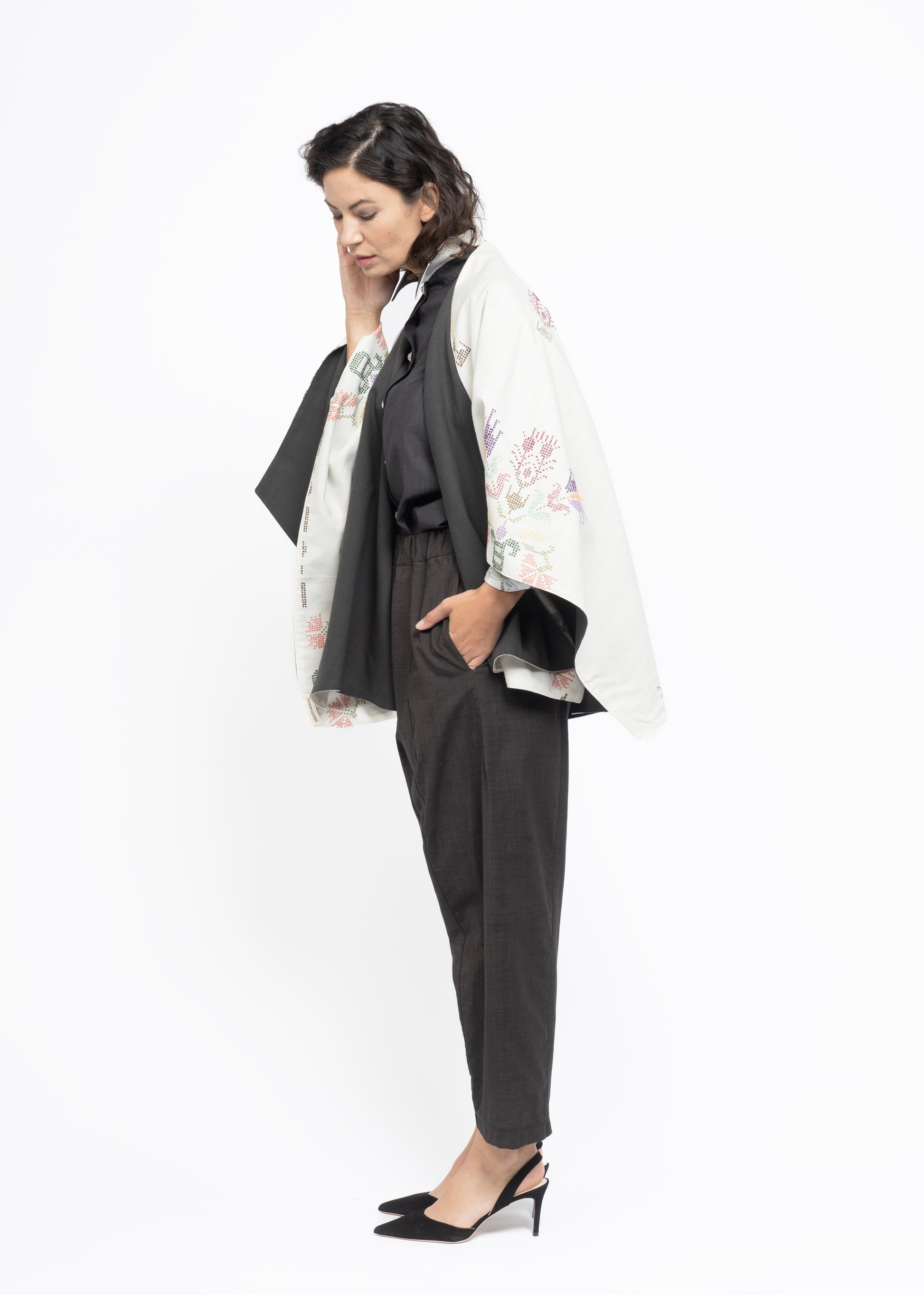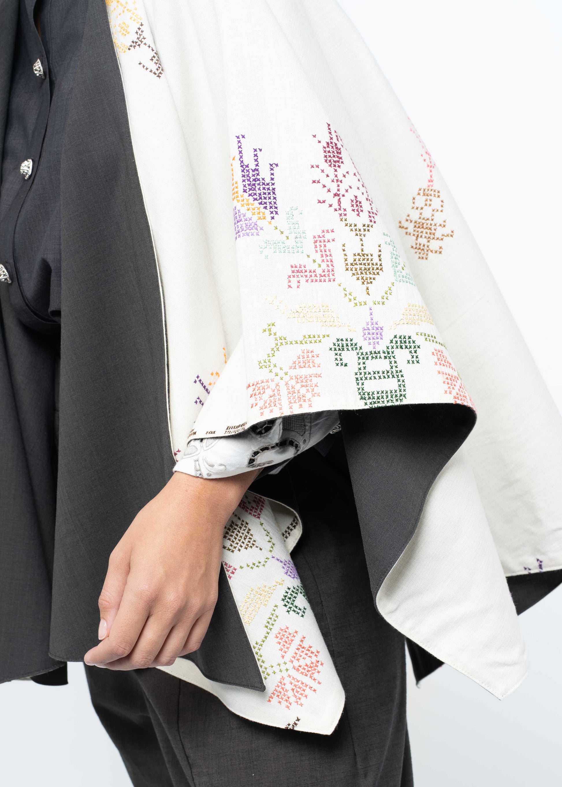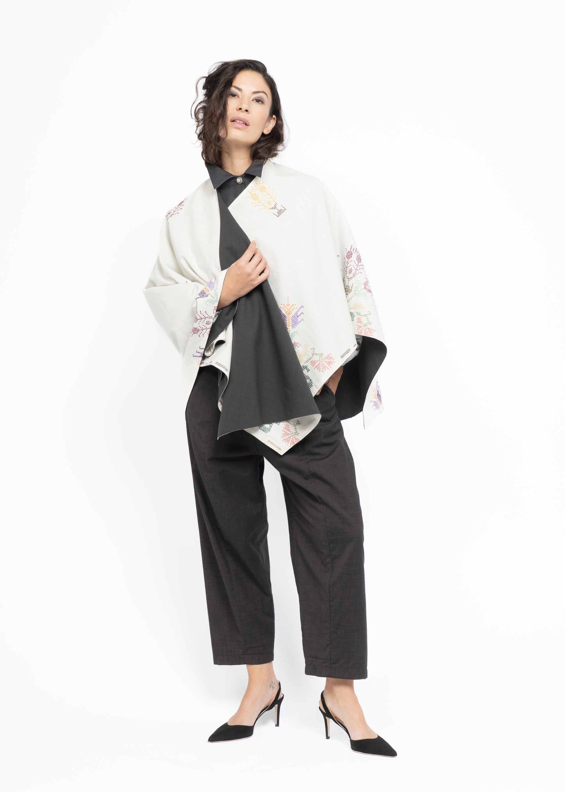 This mantle is crafted from two exceptional fabrics. On one side, lightweight French wool in a sophisticated brown tone, and on the other, Greek hand-embroidered cotton dating back to the 1980s. These contrasting materials come together to create a unique, timeless piece that honors heritage while embodying modern elegance.