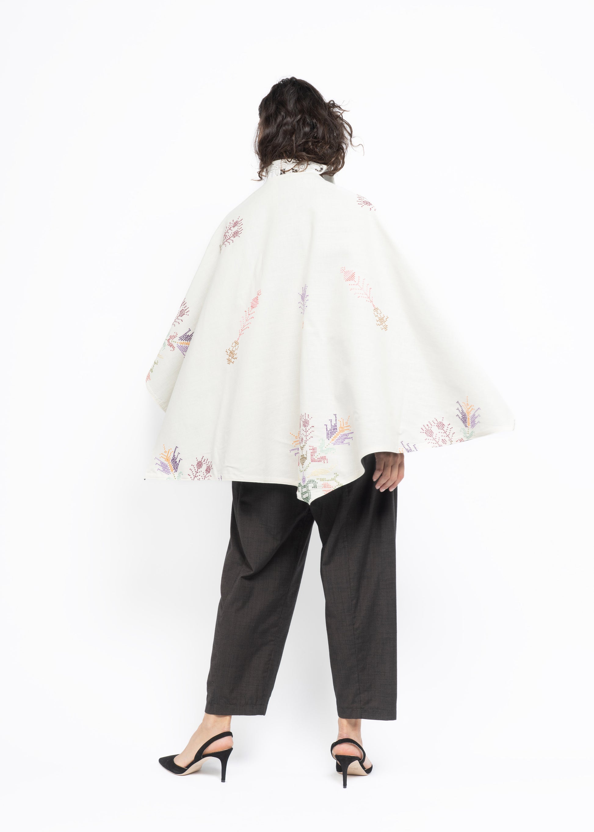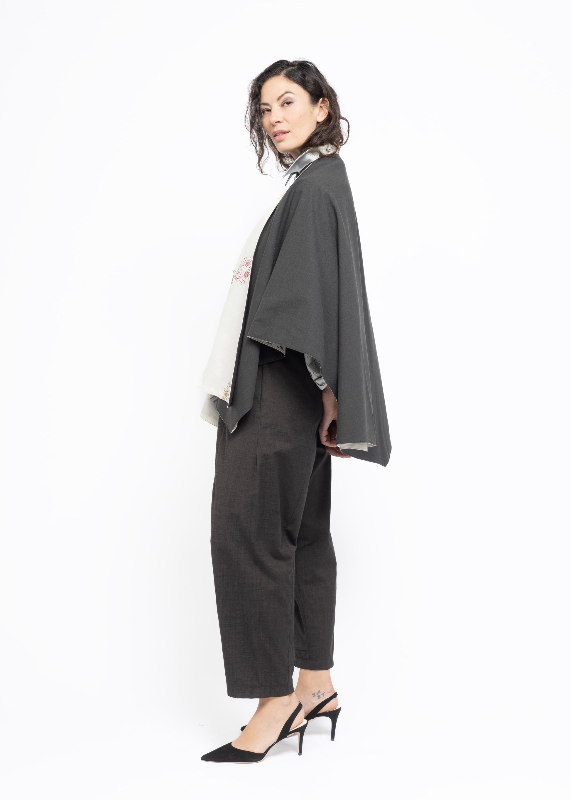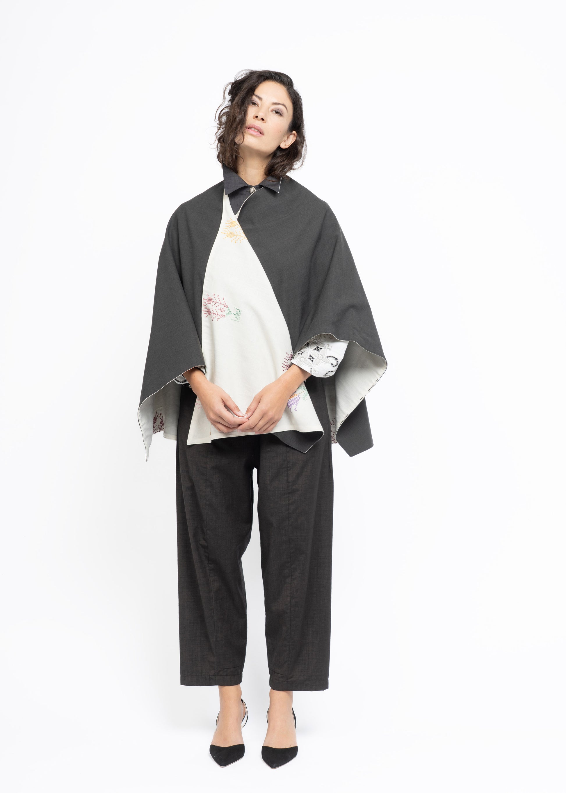 This mantle is crafted from two exceptional fabrics. On one side, lightweight French wool in a sophisticated brown tone, and on the other, Greek hand-embroidered cotton dating back to the 1980s. These contrasting materials come together to create a unique, timeless piece that honors heritage while embodying modern elegance.
