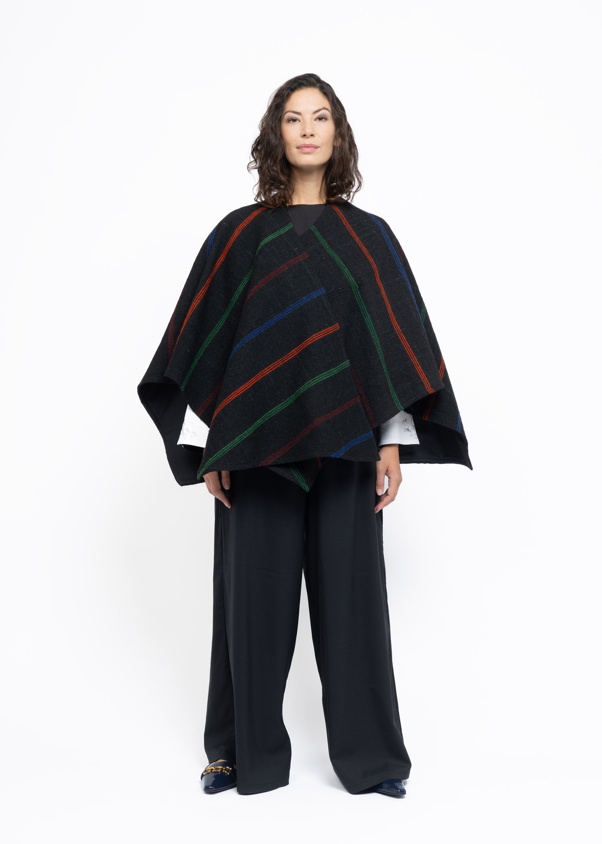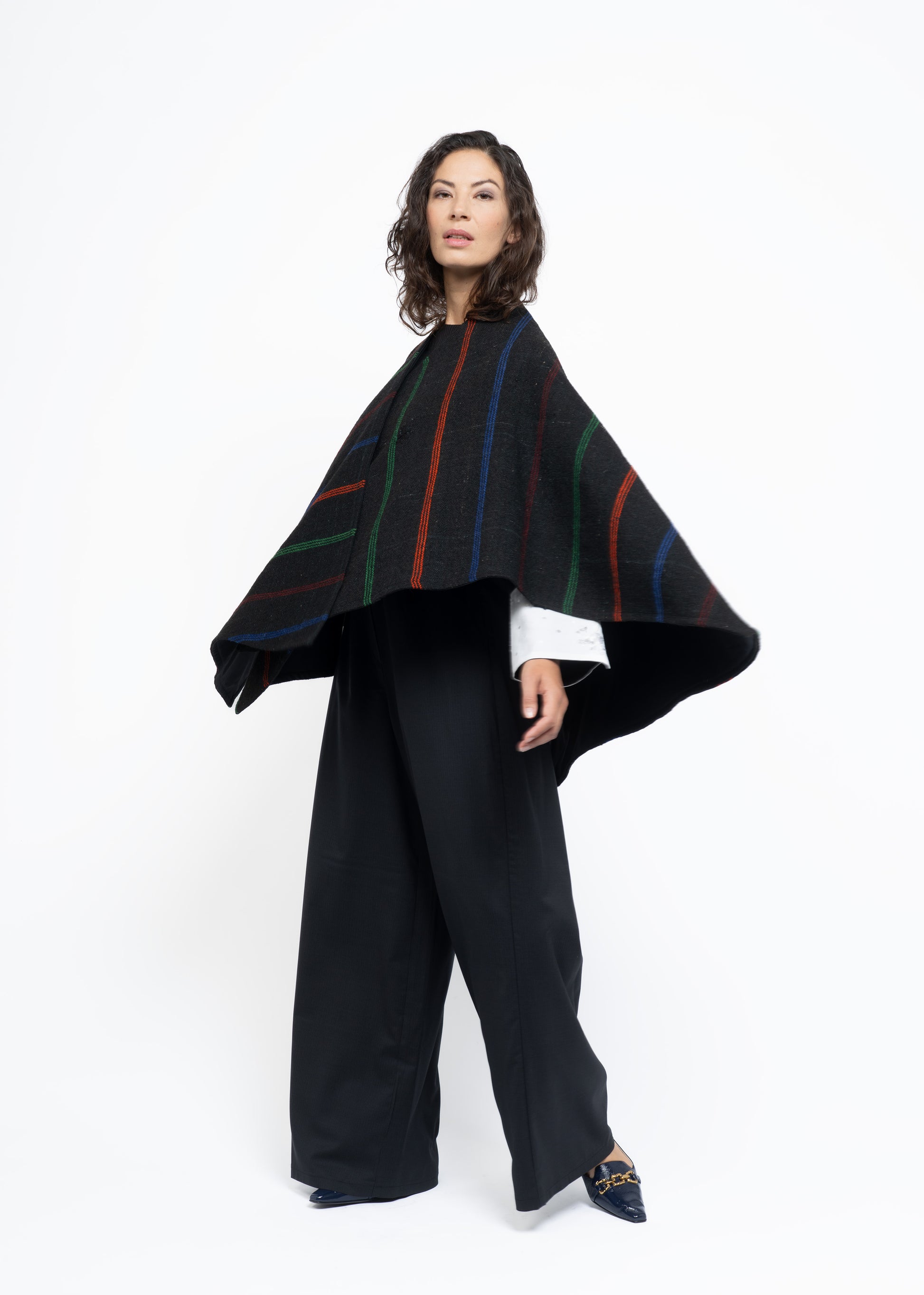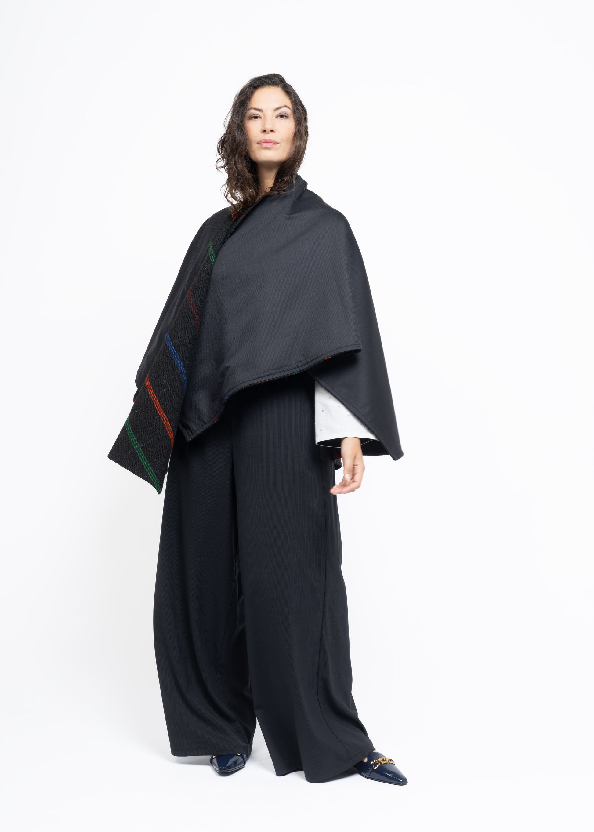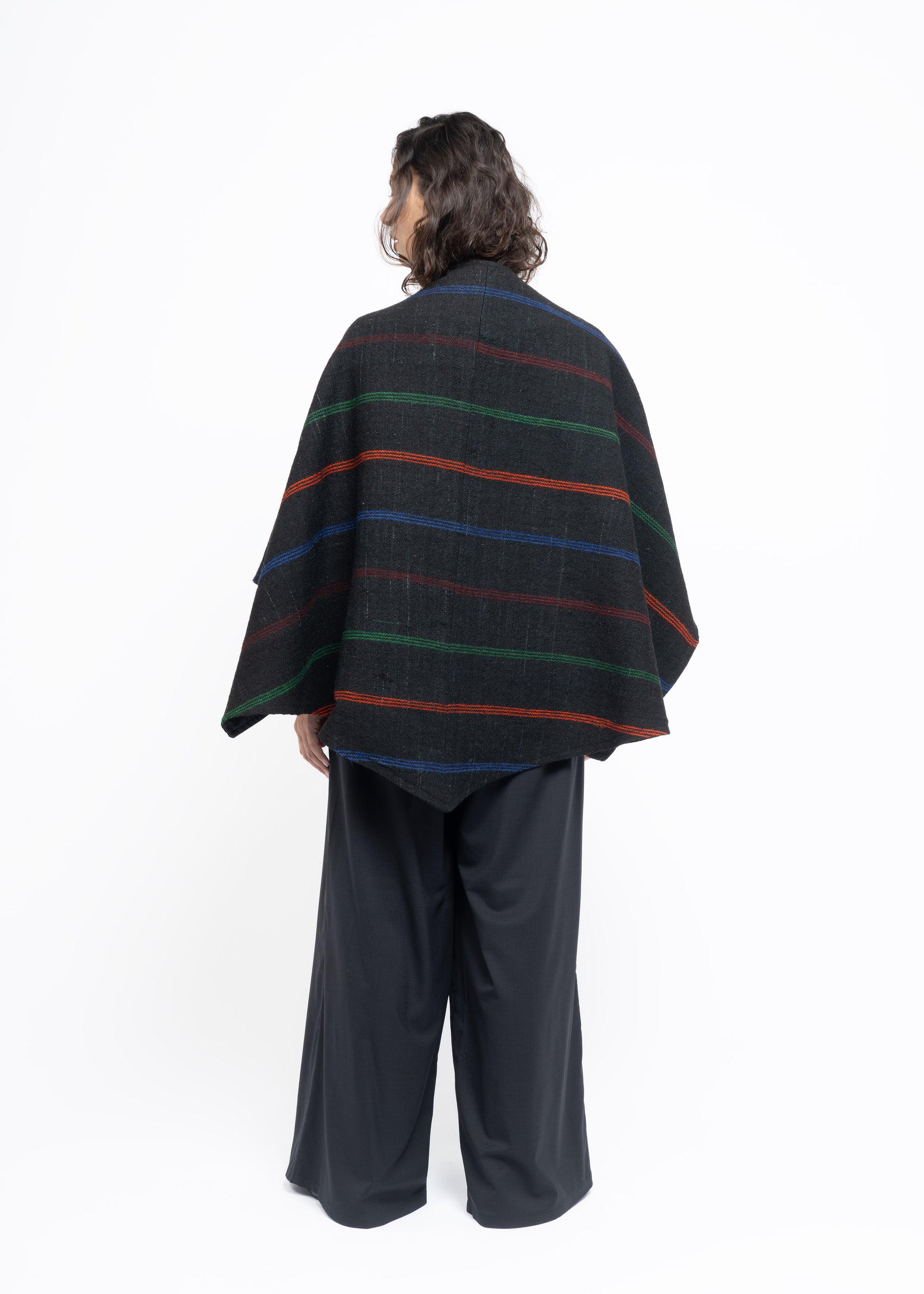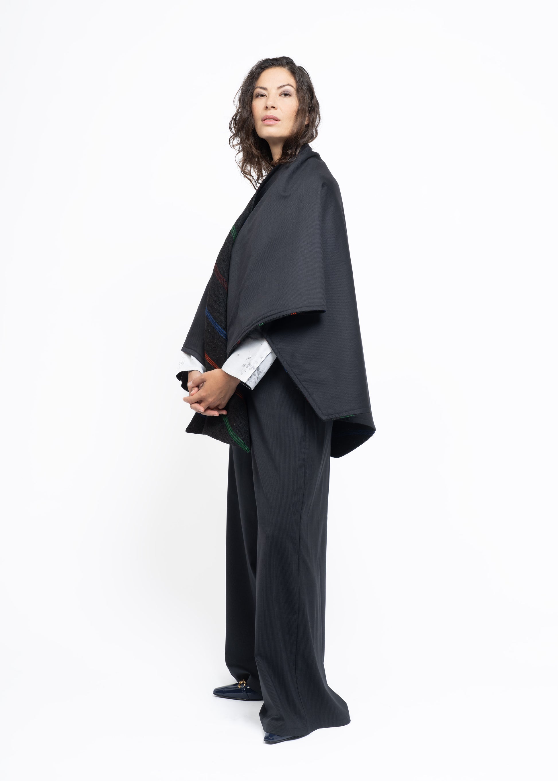 This mantle is crafted from two exceptional fabrics. On one side, lightweight French wool in a sophisticated charcoal tone, and on the other, handwoven Greek sheep’s wool dating back to the 19th century, carefully restored and revitalized. These contrasting materials are brought together to create a unique, timeless piece that honors heritage while offering modern elegance.