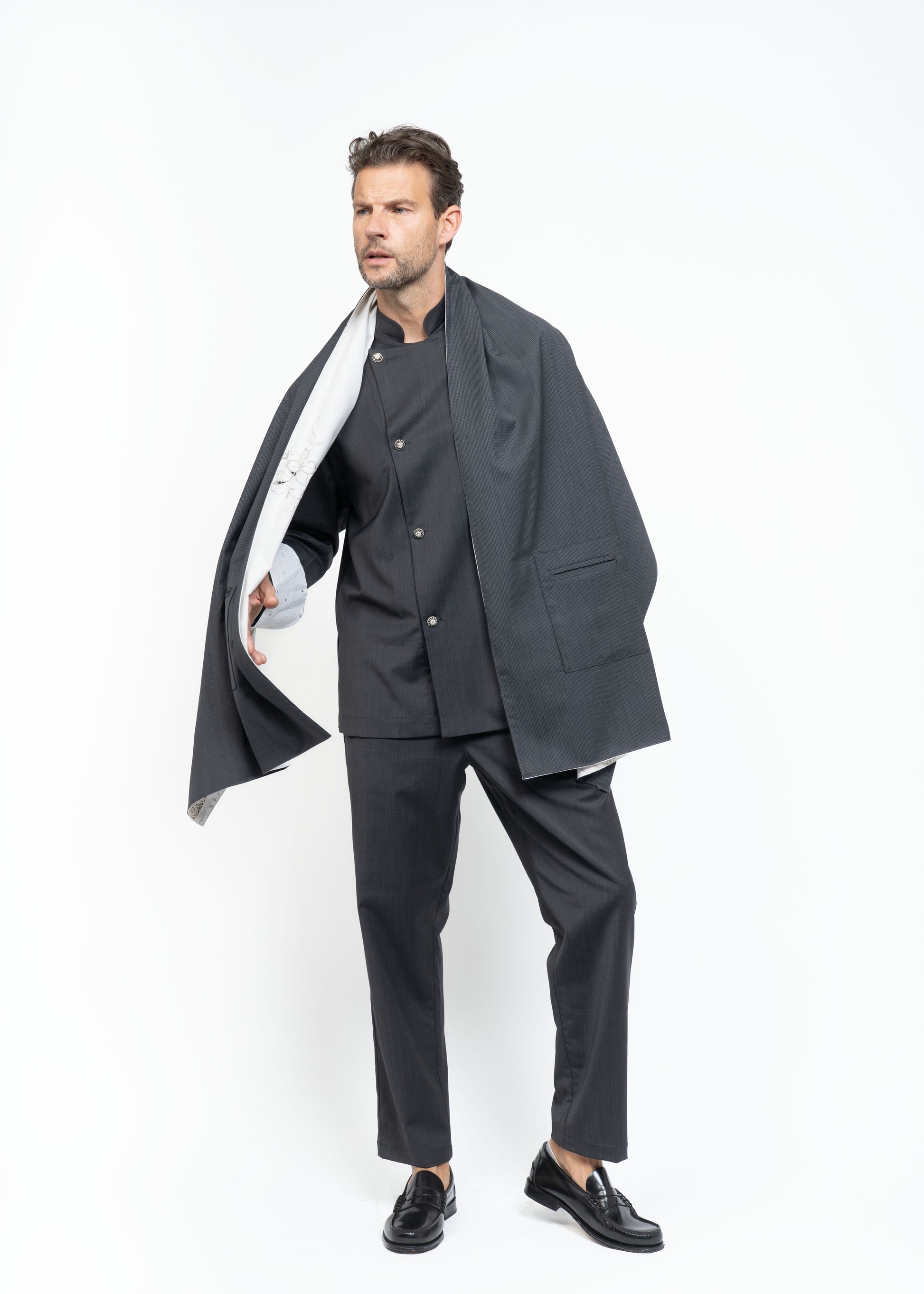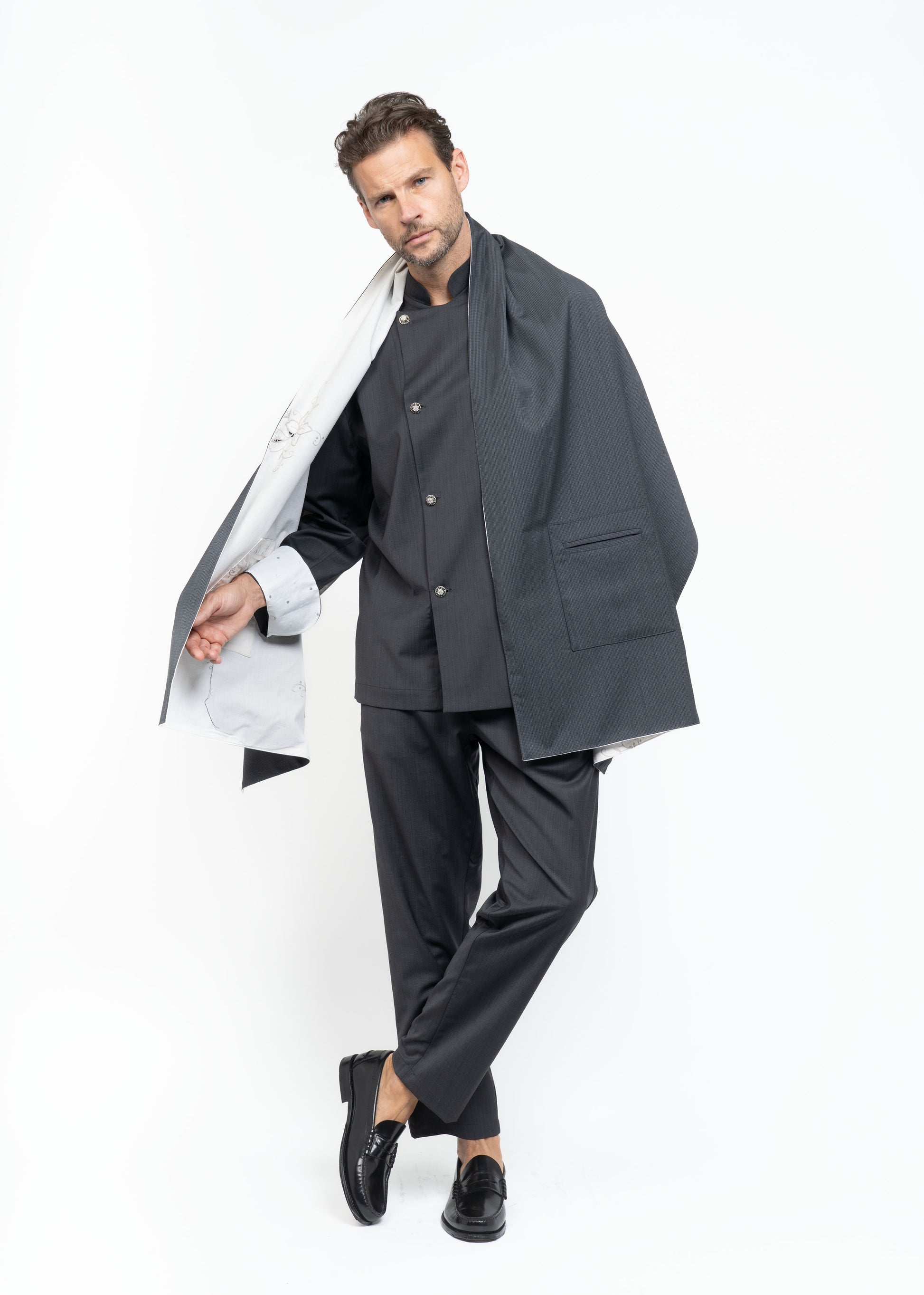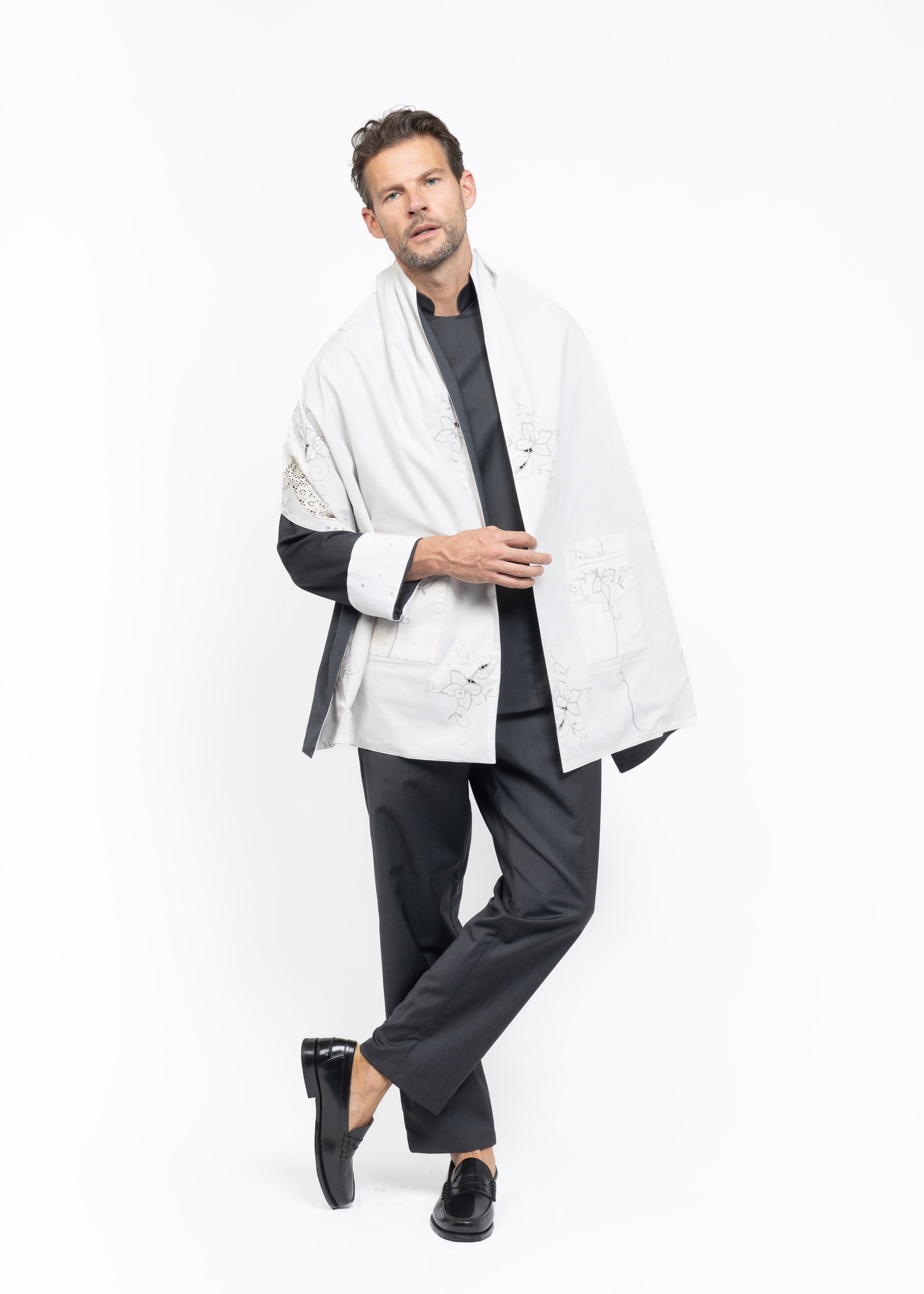 This versatile shawl is crafted from lightweight French wool on one side and features exquisite Greek embroidery from the 1980s on the other. Its double-faced rectangular design allows it to be styled in multiple ways, draped over the shoulders, layered as a wrap, or worn like a jacket with functional pockets. Combining heritage craftsmanship with modern elegance, it elevates both casual and formal outfits.