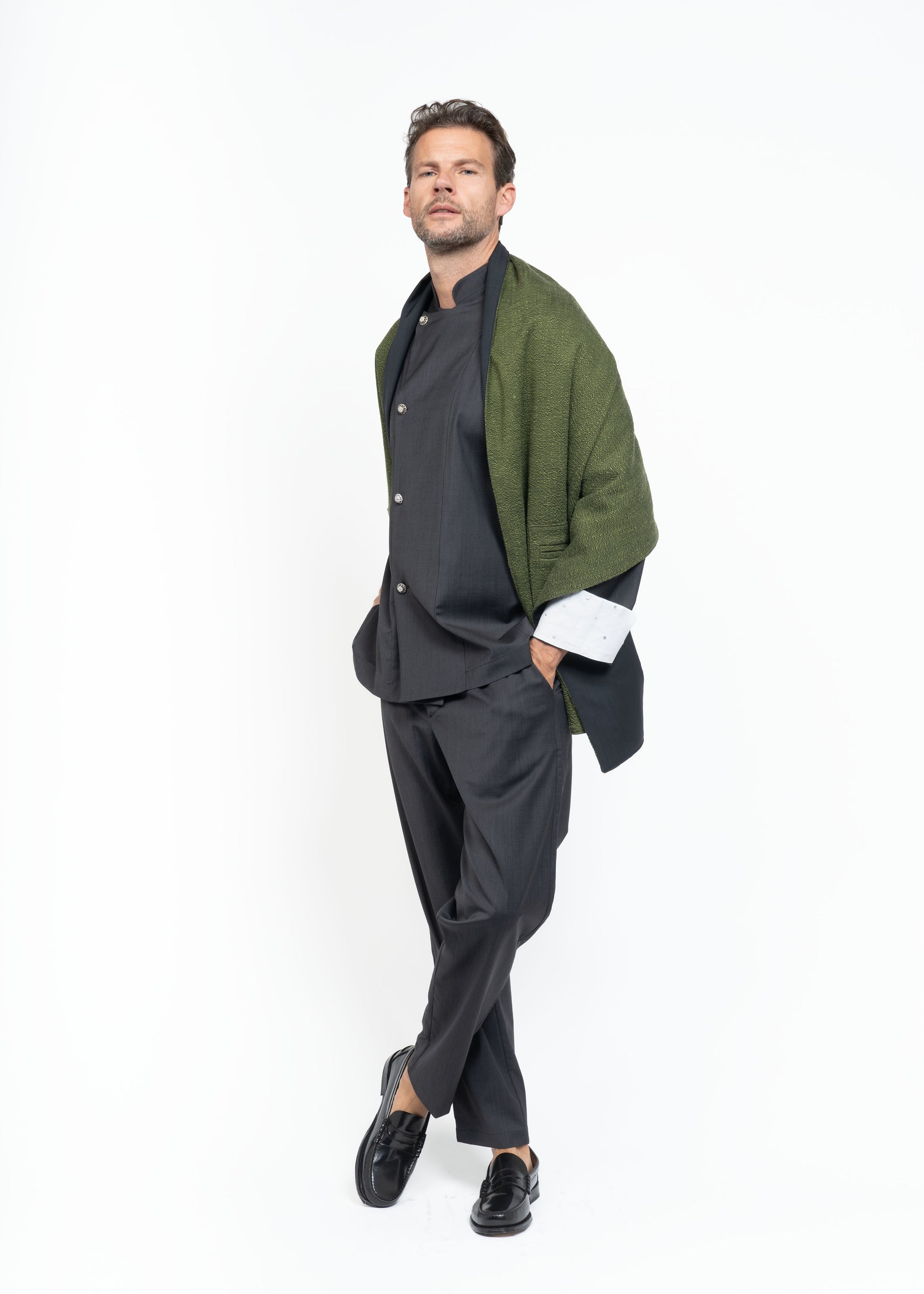 This versatile shawl is crafted from handwoven Greek Flamma, made on traditional looms, and combined with lightweight French wool. Its rectangular, double-faced design allows it to be worn on either side, draped over the shoulders, or styled like a jacket thanks to functional pockets. Perfect for elevating both casual and evening looks, it blends heritage craftsmanship with modern elegance.