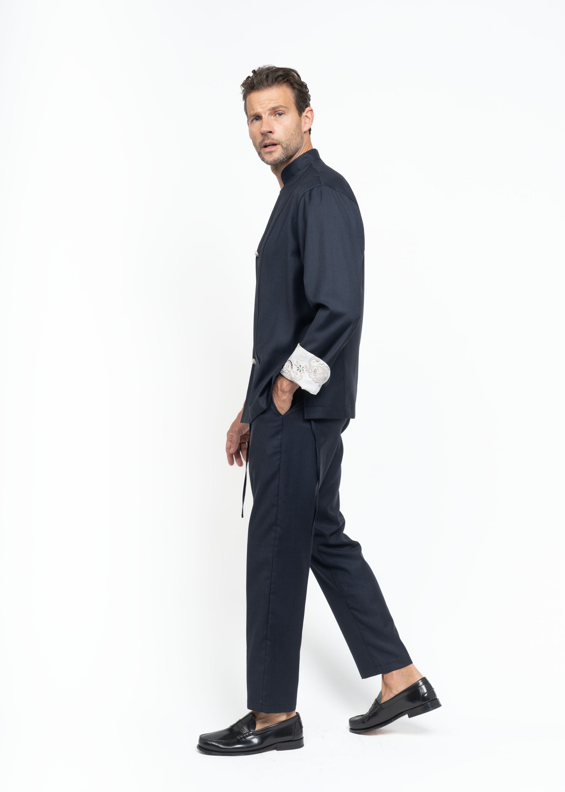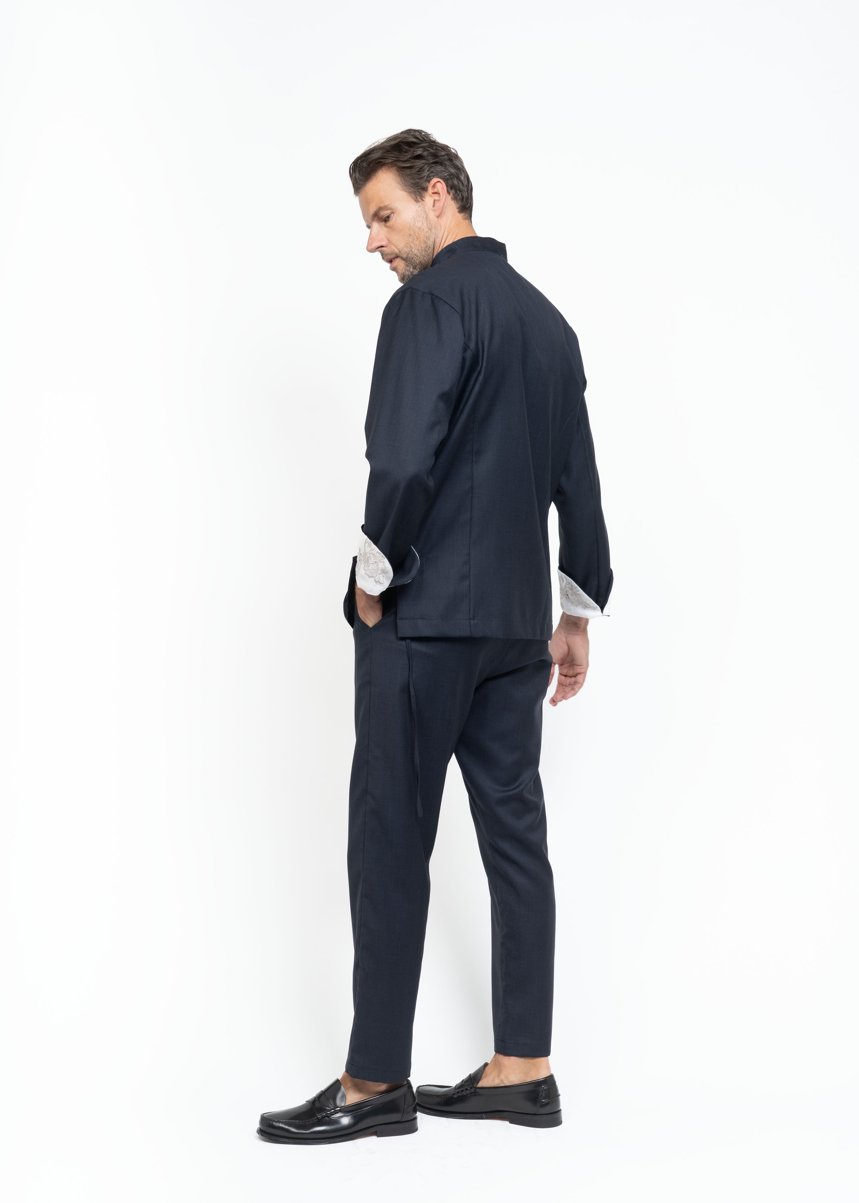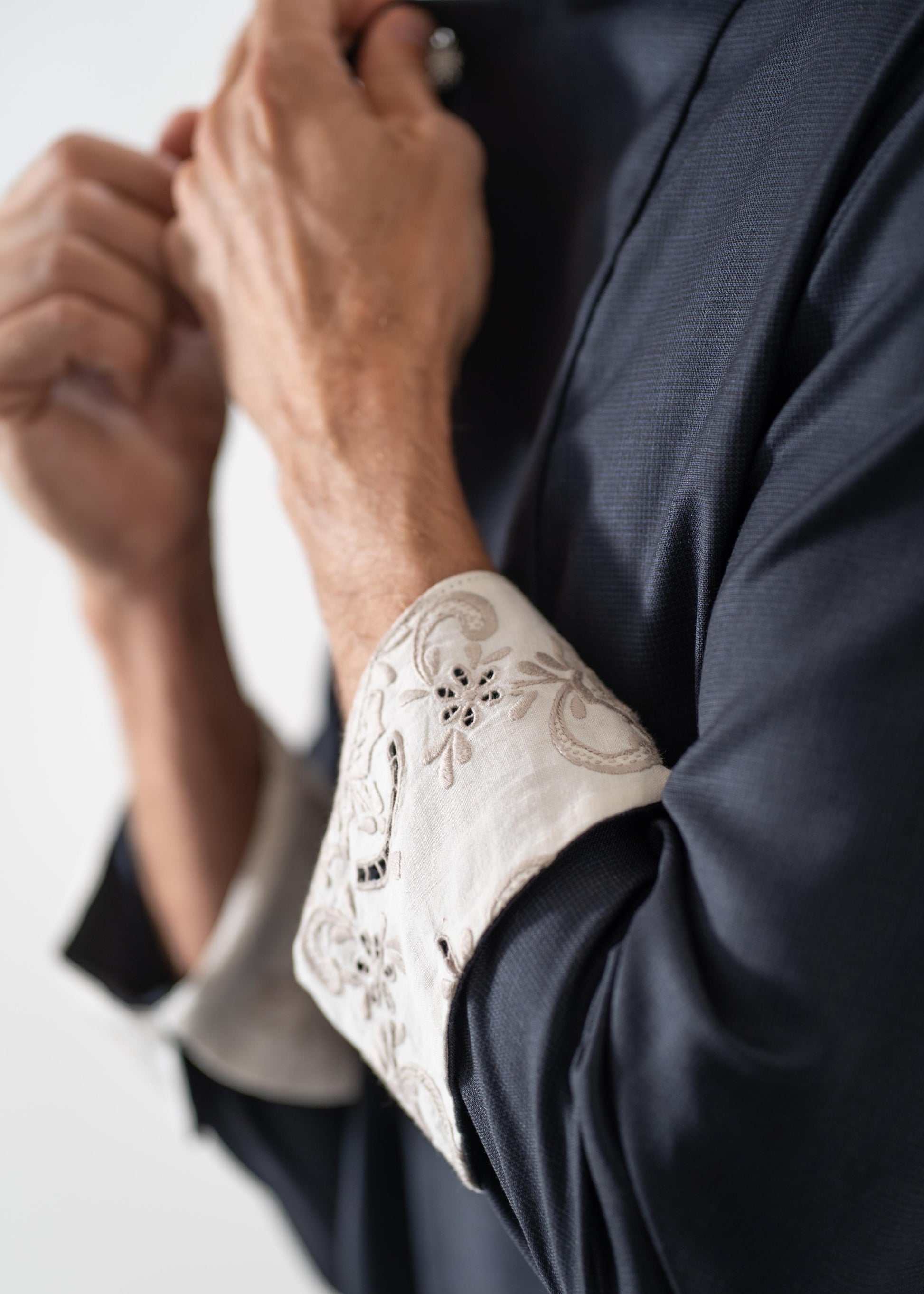 Crafted from lightweight blue wool in a subtle Prince of Wales check, this shirt features cuffs adorned with intricate handwork that serve as witnesses to history. The Greek embroidery, dating back to the early 1980s, has been carefully restored and revitalized, preserving its original charm and character. A timeless piece that seamlessly blends heritage craftsmanship with contemporary elegance.
