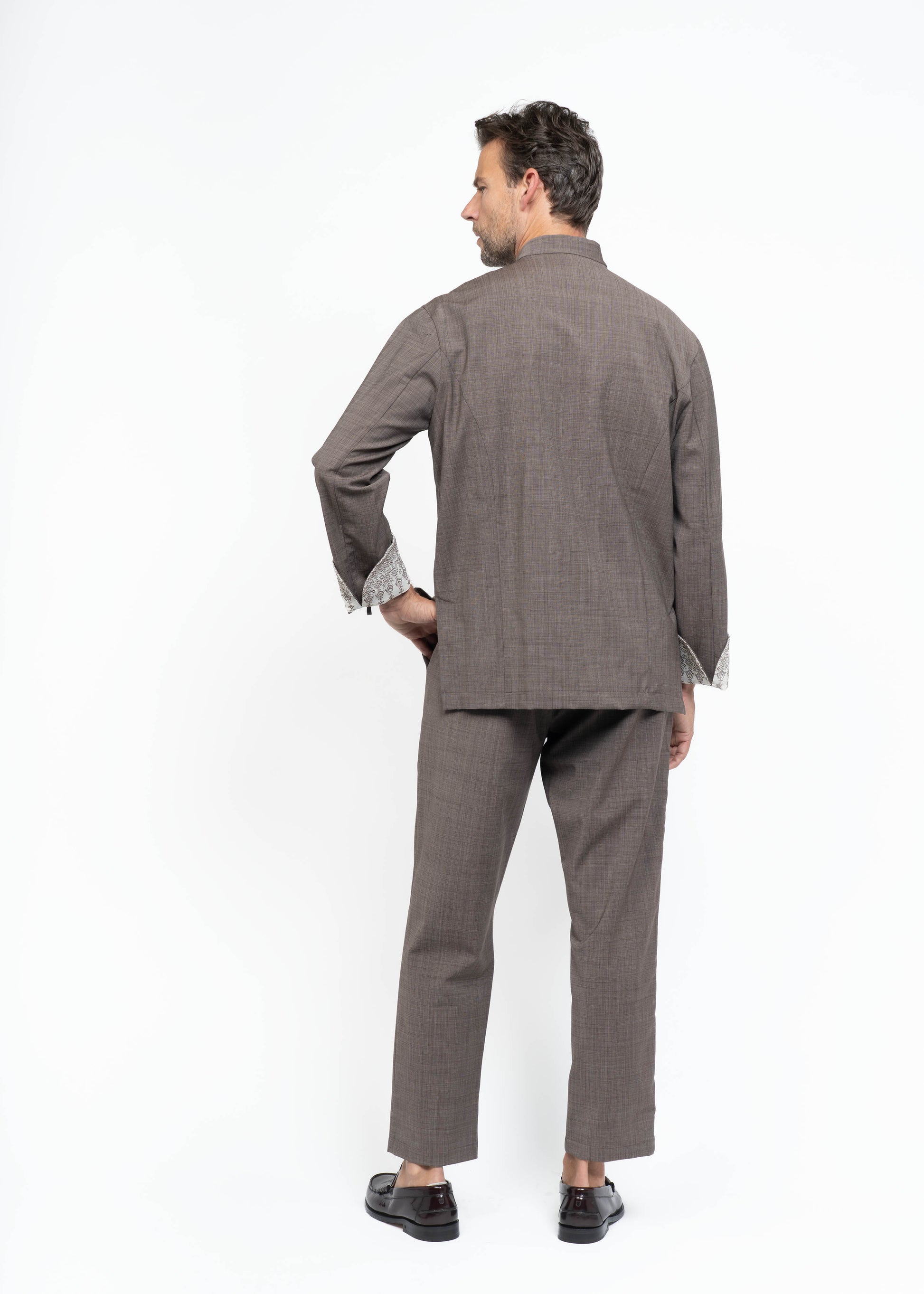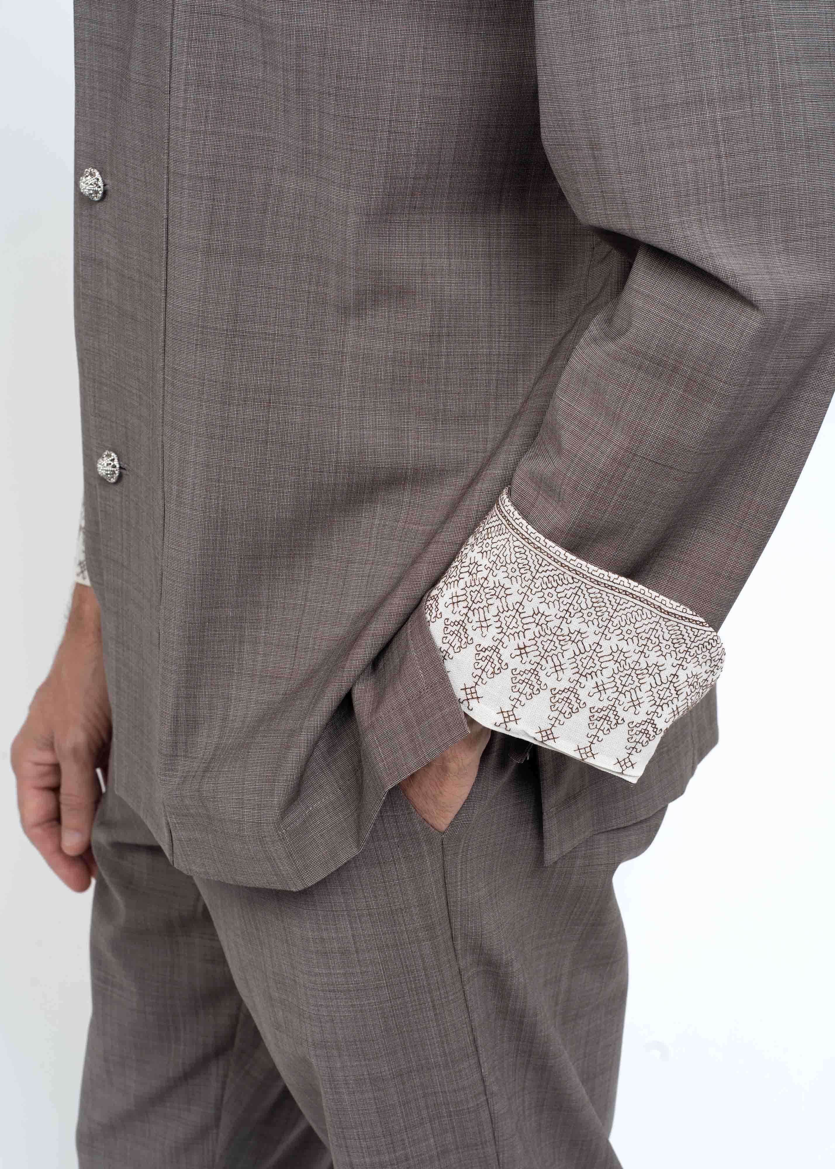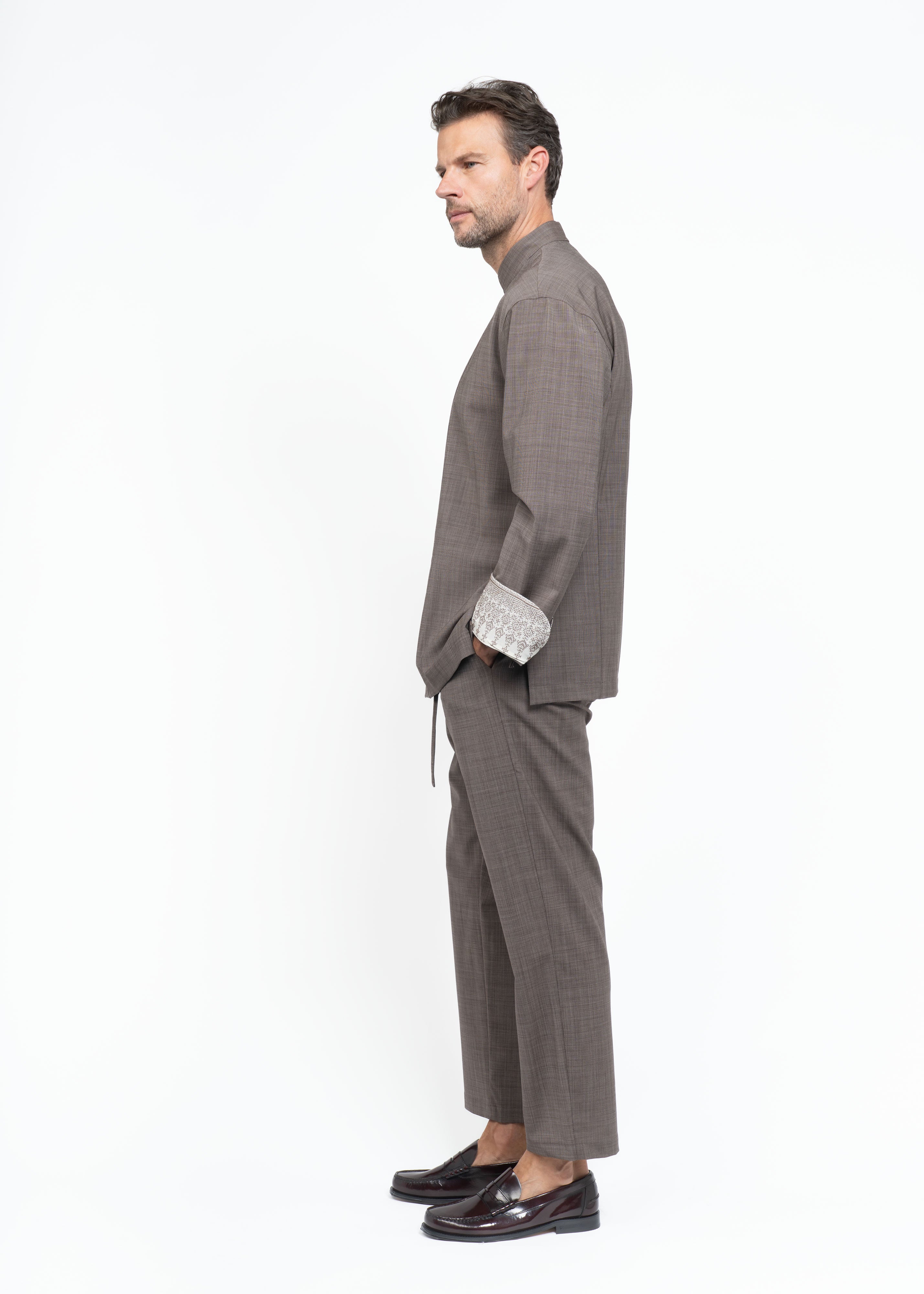 Crafted from lightweight wool in a warm light brown tone, this shirt features cuffs adorned with intricate handwork that serve as witnesses to history. The Greek embroidery, dating back to the early 1970s, has been carefully restored and revitalized, preserving its original beauty. A timeless piece that blends heritage craftsmanship with contemporary elegance.
