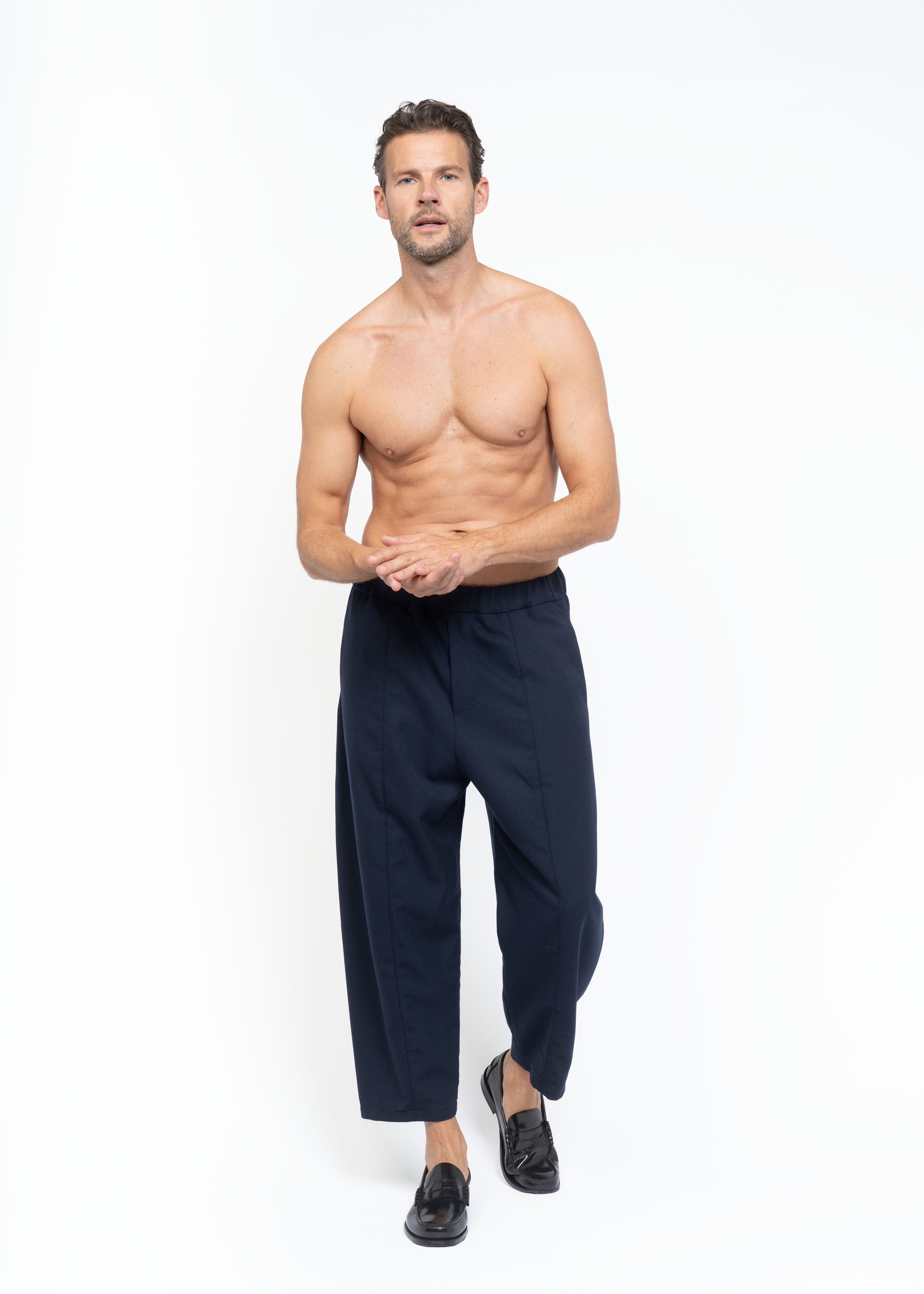 "The Pants" feature an elastic waistband that enhances comfort and freedom of movement without sacrificing style or formality. They have an ankle-length cut and a loose fit, offering both elegance and ease.