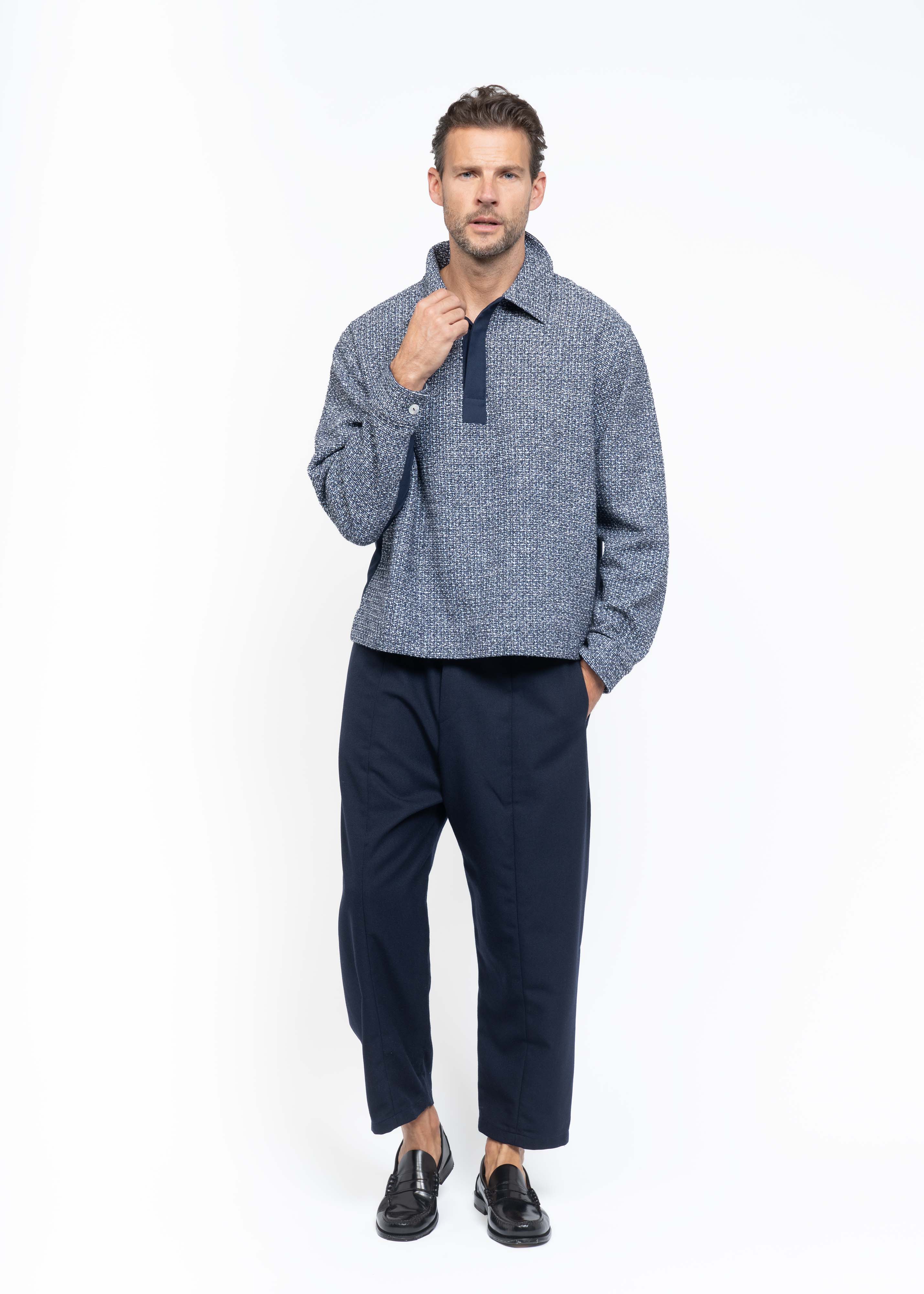 The Polo Shirt is crafted from the finest French boucle, seamlessly combined with subtle French wool. Featuring a classic collar with three buttons and understated hidden details, it embodies the perfect balance between heritage craftsmanship and modern elegance.