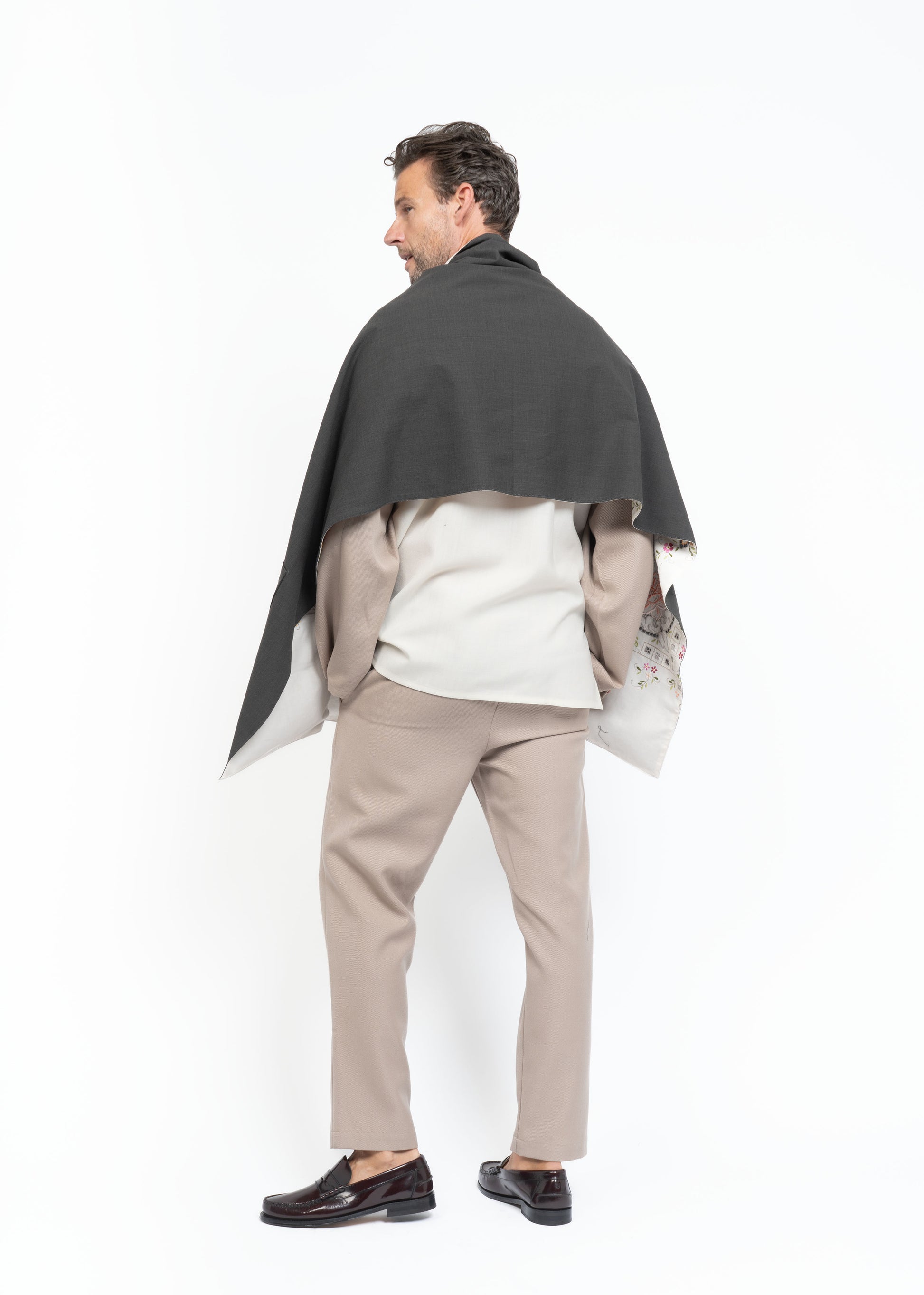 This versatile shawl is crafted from lightweight French wool in a warm brown tone and features vibrant Greek multicolor embroidery. Its double-faced rectangular design allows it to be styled in multiple ways, draped over the shoulders, layered as a wrap, or worn like a jacket with functional pockets. A harmonious blend of heritage craftsmanship and contemporary elegance, it elevates both casual and formal looks.